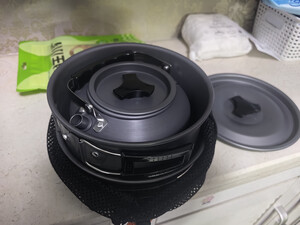 一个平锅,一个煮锅,还有一个小烧水壶,套在一起收纳10分方便。每个锅子都很轻薄薄的,看材料是太空铝的,做工看上去比较精细,还没有用,不知是否耐用。