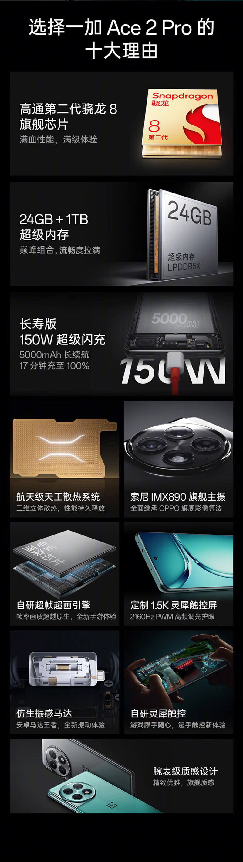 一加Ace2Pro 游戏拍照手机第二代骁龙8芯片 1.5K灵犀触控屏 5G全网通 钛空灰 24GB+1TB 单机+第三方品牌充电器+店保1年