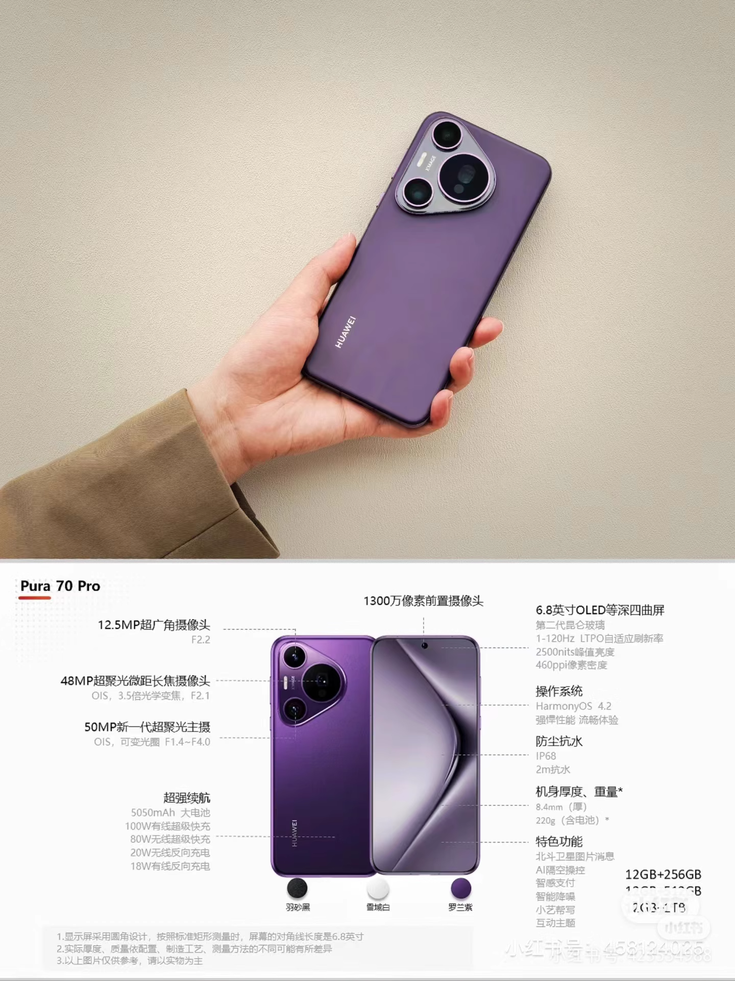华为(HUAWEI)HUAWEI/华为Pura70Pro 5G手机2025年新款智能游戏学生鸿蒙系统 罗兰紫 12GB+512GB 【下单前联系客服领碎屏险】
