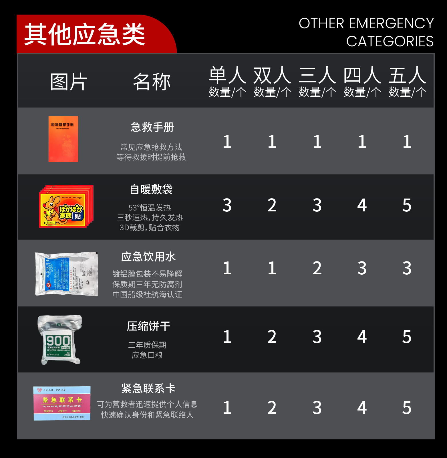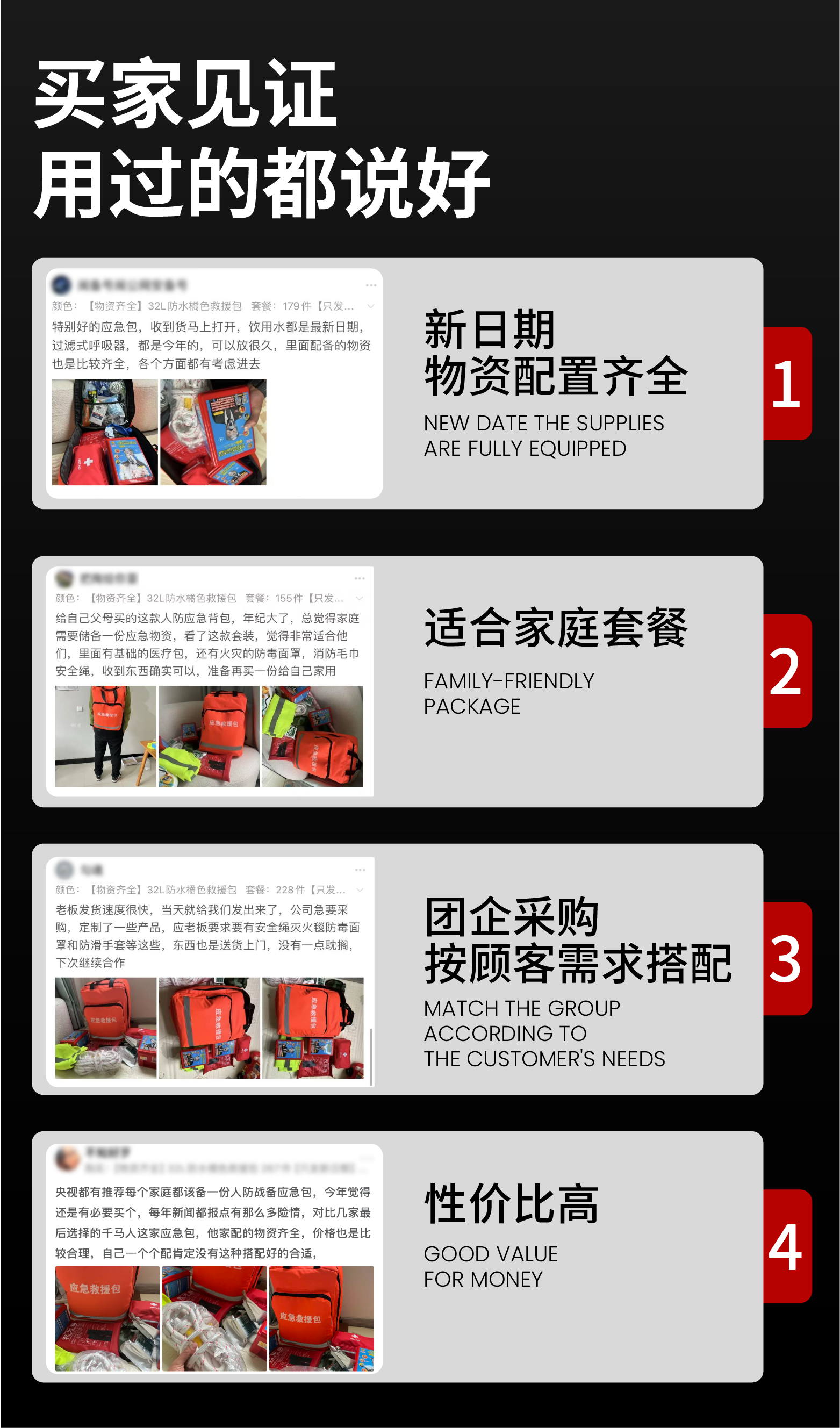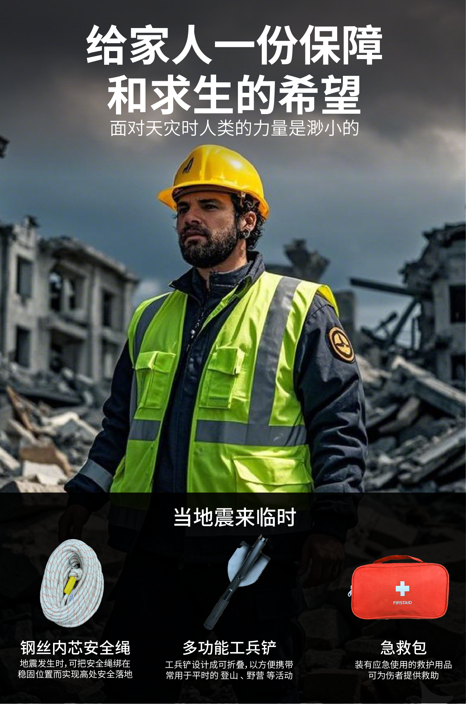 小的地震频发 买来备一份 心里面会踏实一些 挑选了几家 最后选择的这家 套装真心的不错 除了应对地震之外 火灾 洪水 台风 一些自然灾害都能应对