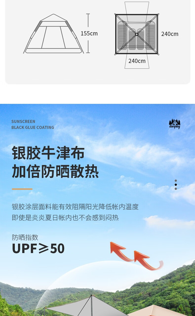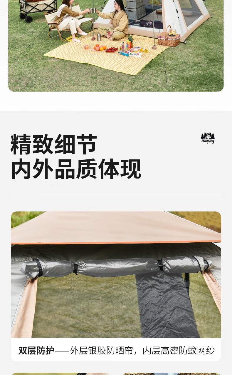 大失所望,帐篷一背外包装袋就坏了,搭起来皱巴巴的,一点都不挺括有型,软塌塌的,门厅也撑不起来,和图片差异太大,感觉在整个一排的帐篷里是最差的风景线.