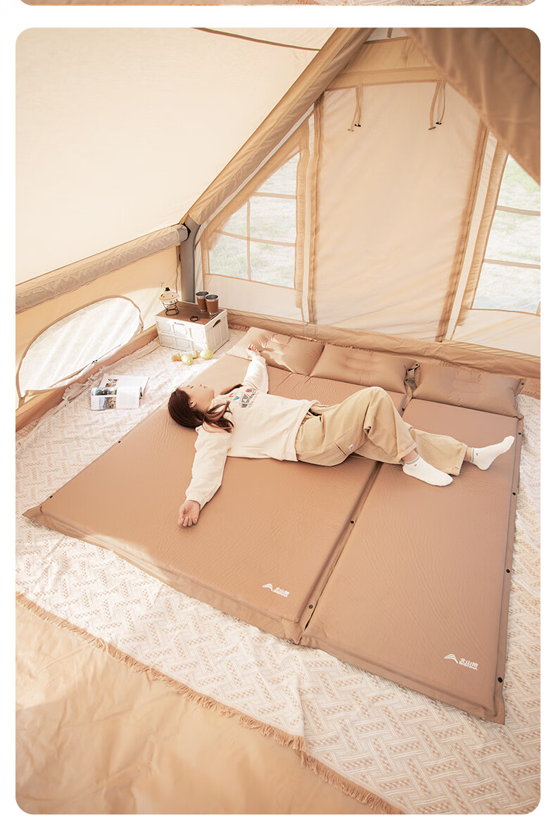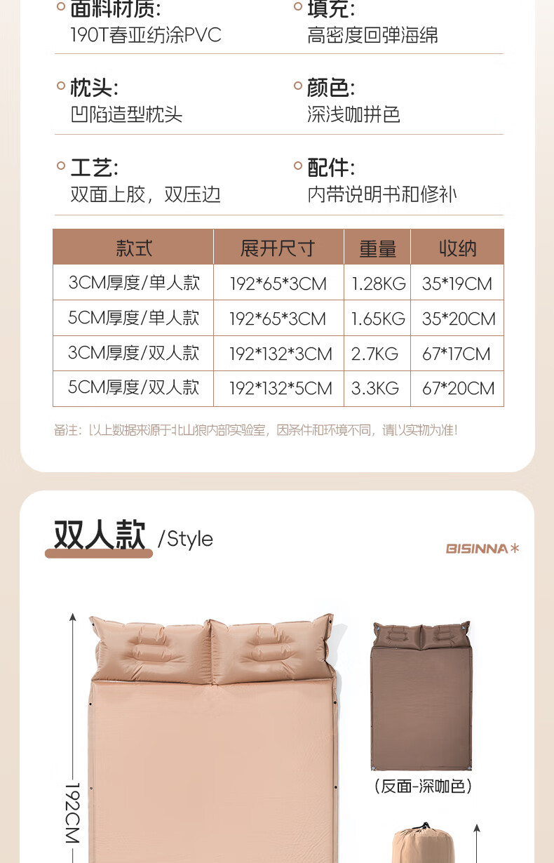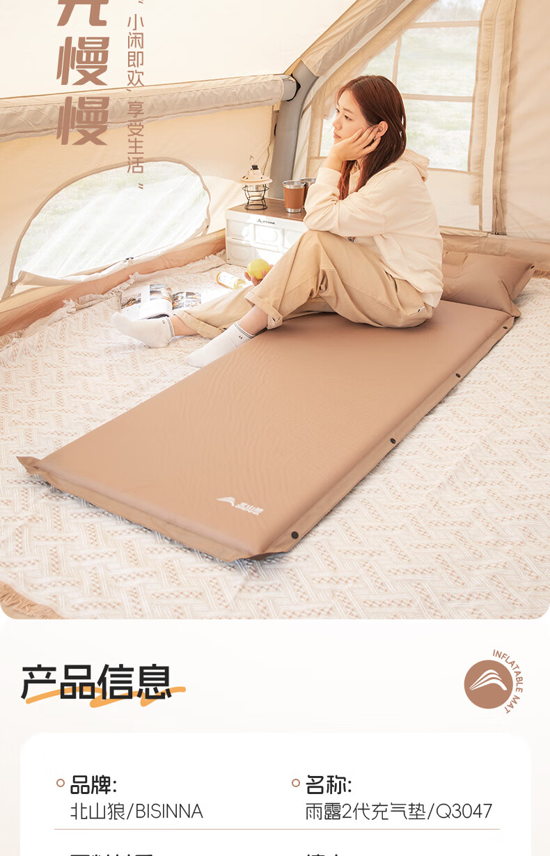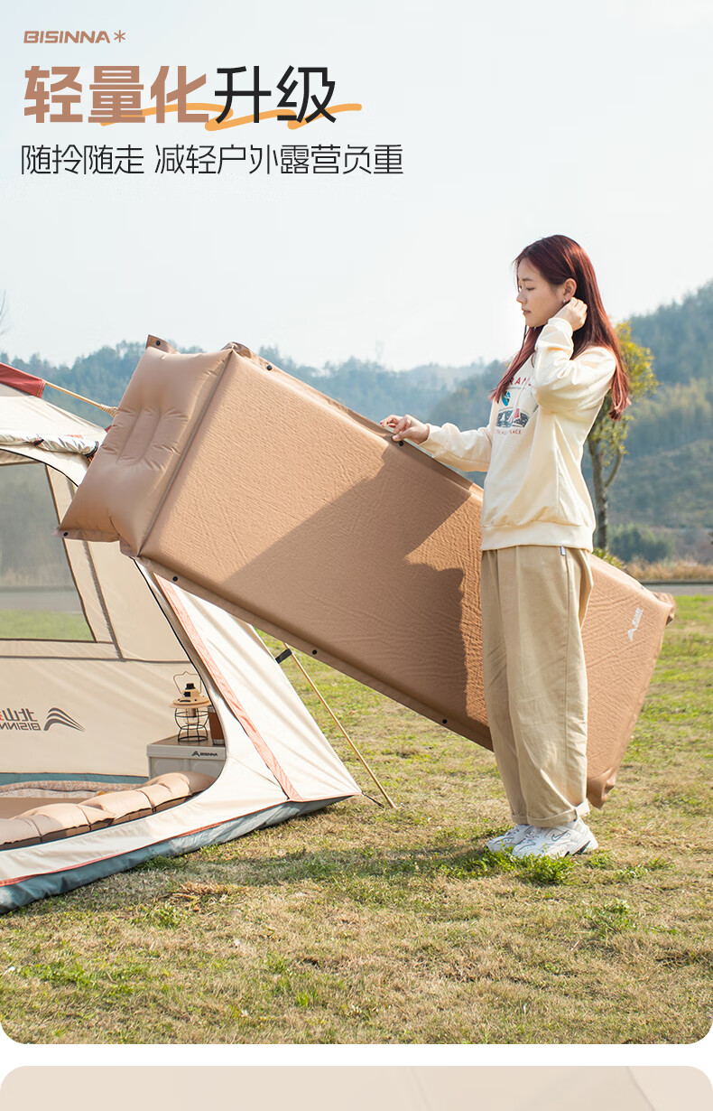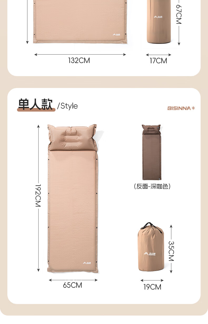 北山狼防潮海绵垫自动充气垫加厚户外气垫床单人午休睡垫帐篷露营睡垫 单人5cm厚深浅咖拼色-自带枕头