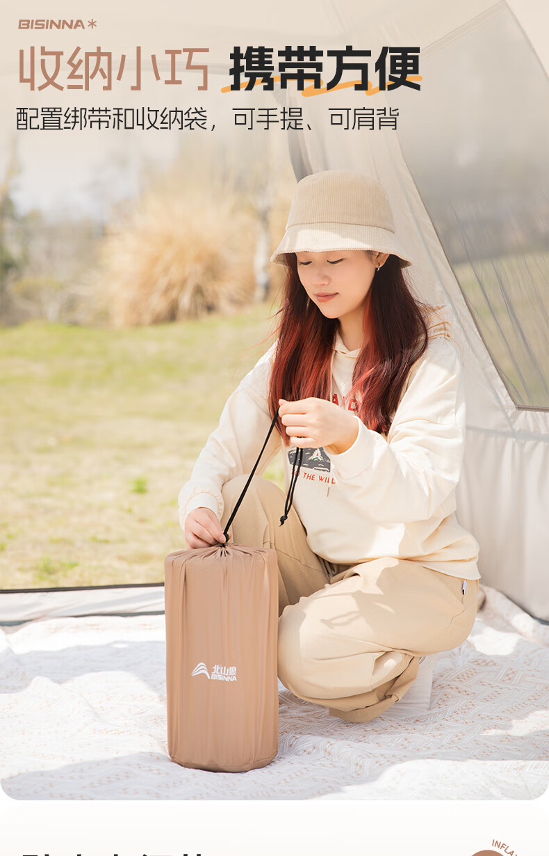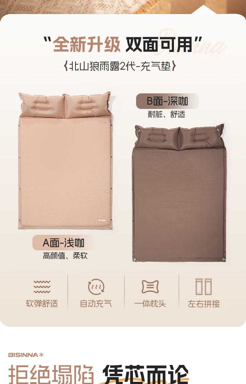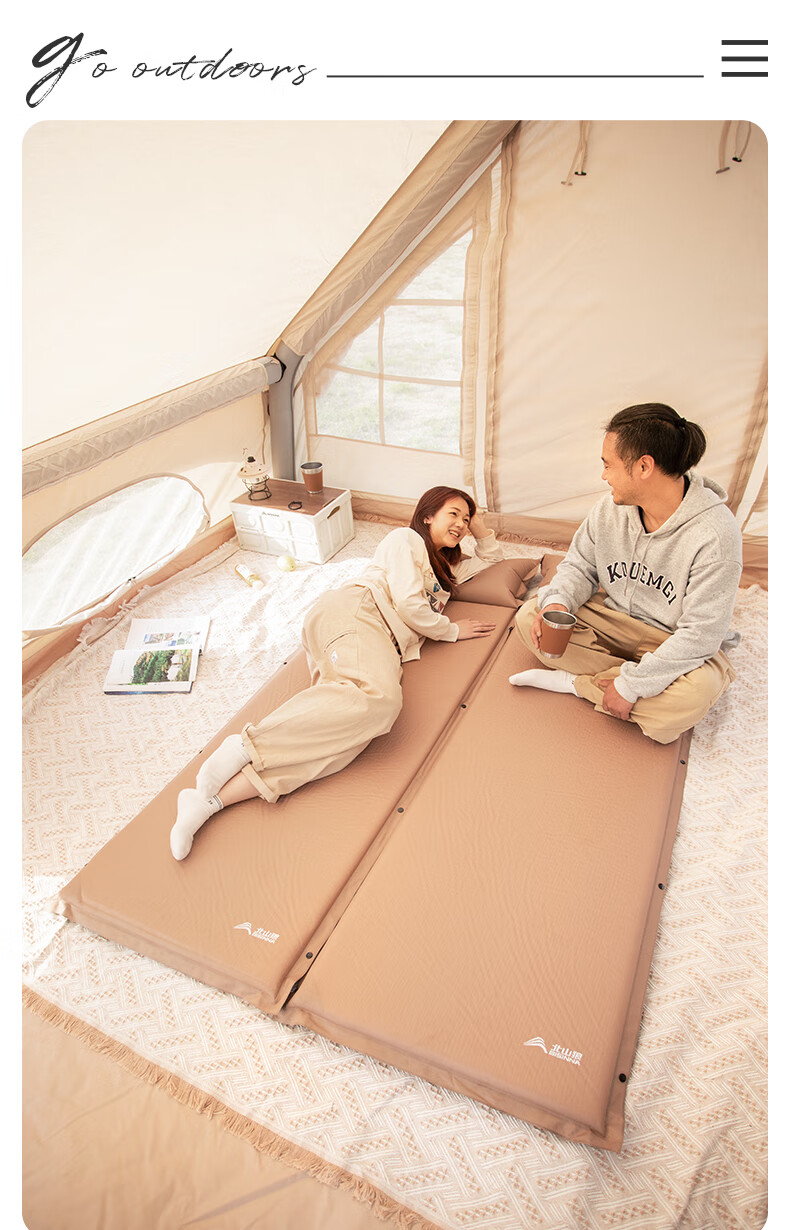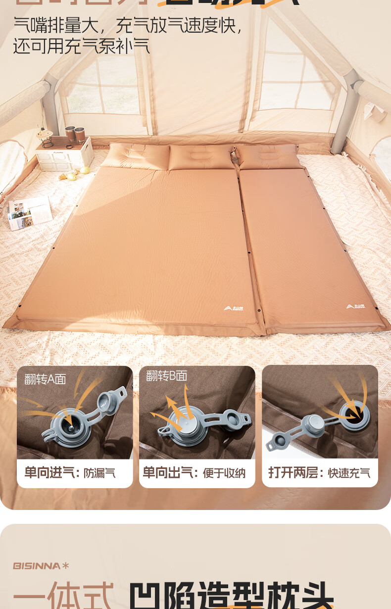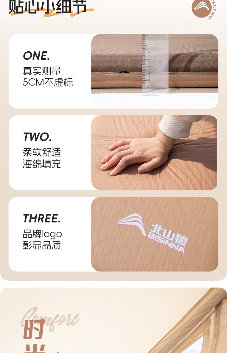 北山狼防潮海绵垫自动充气垫加厚户外气垫床单人午休睡垫帐篷露营睡垫 单人5cm厚深浅咖拼色-自带枕头