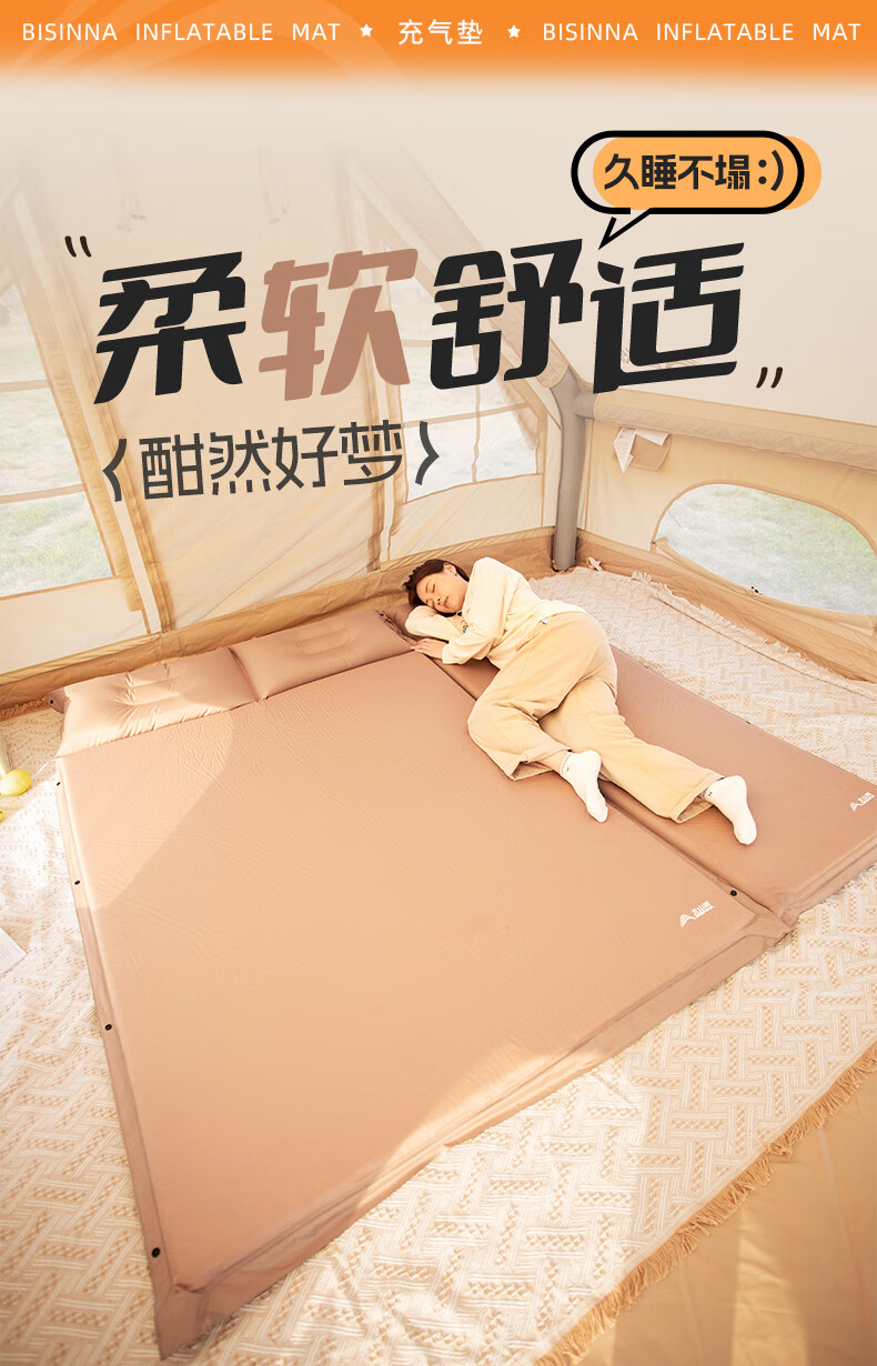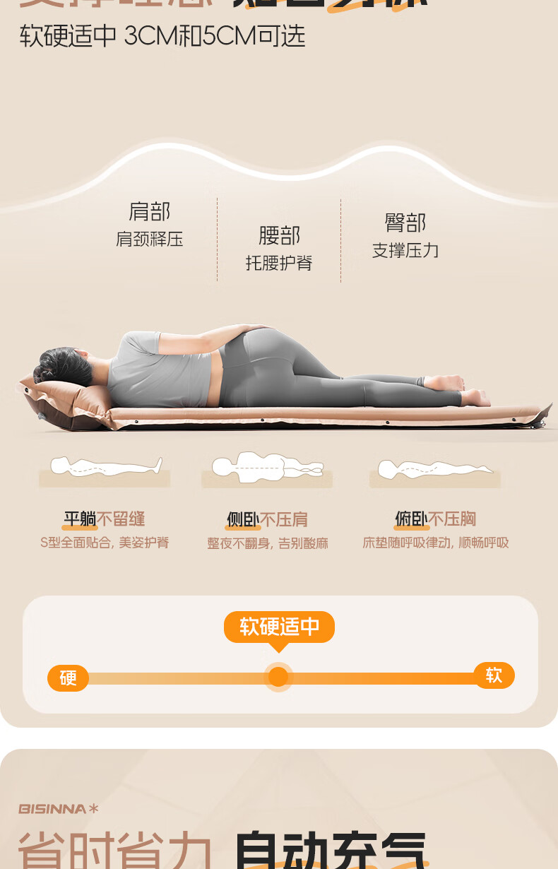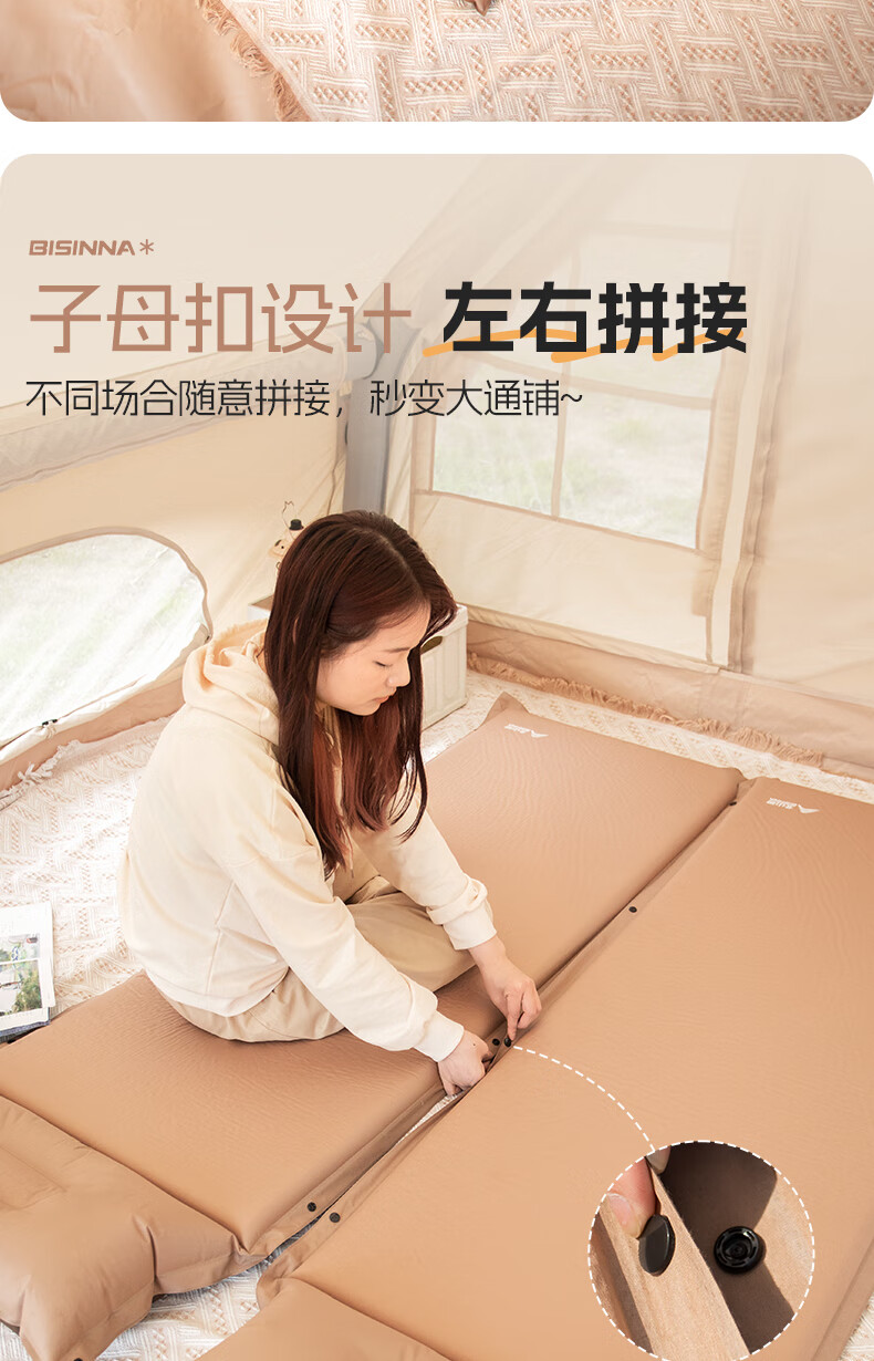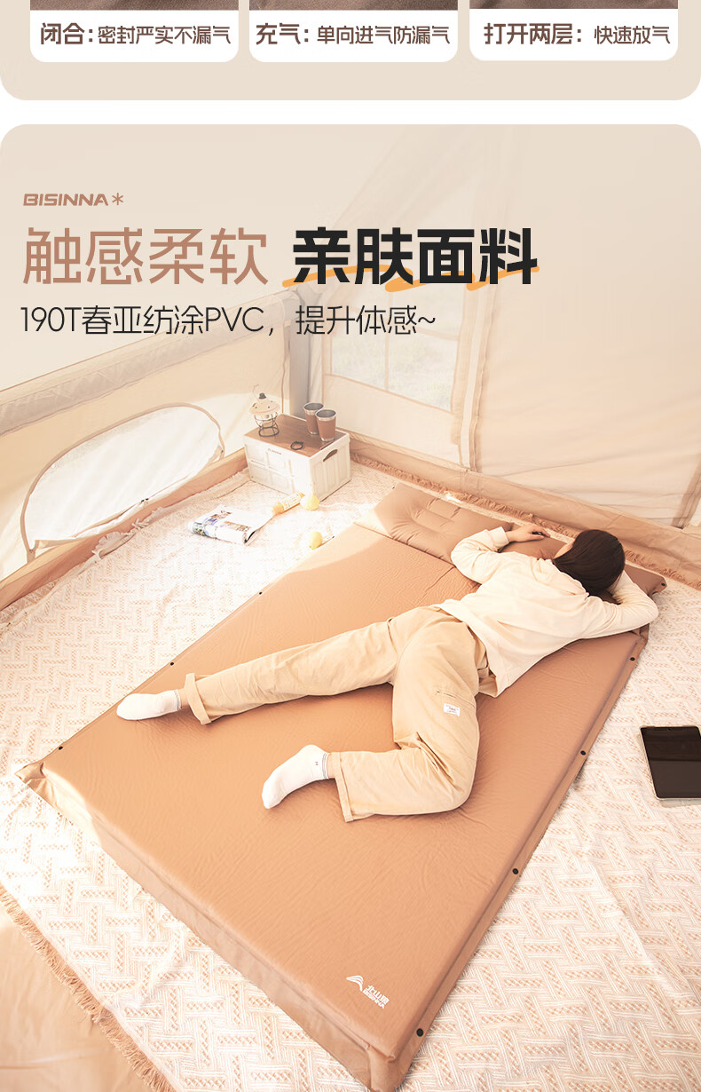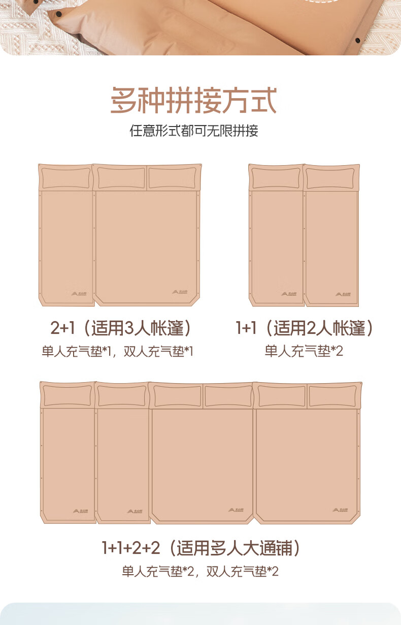 北山狼防潮海绵垫自动充气垫加厚户外气垫床单人午休睡垫帐篷露营睡垫 单人5cm厚深浅咖拼色-自带枕头