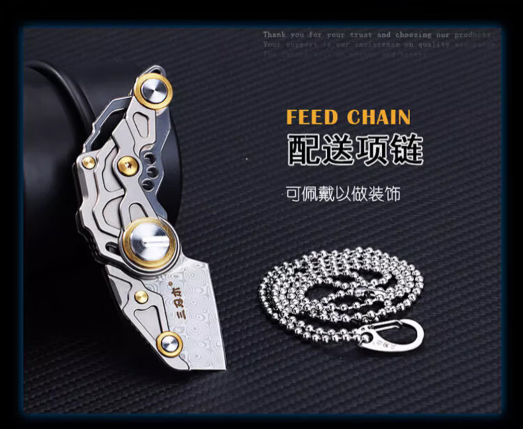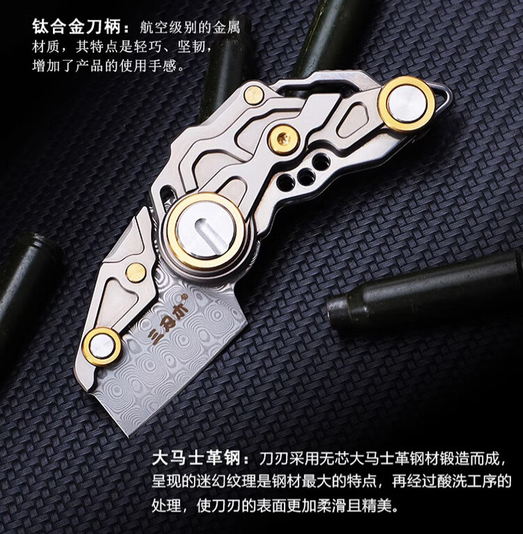三刃木大马士革钢小折刀高碳钢高硬度锋利户外日用水果开箱挂脖刀6185N 钛合金珠光色