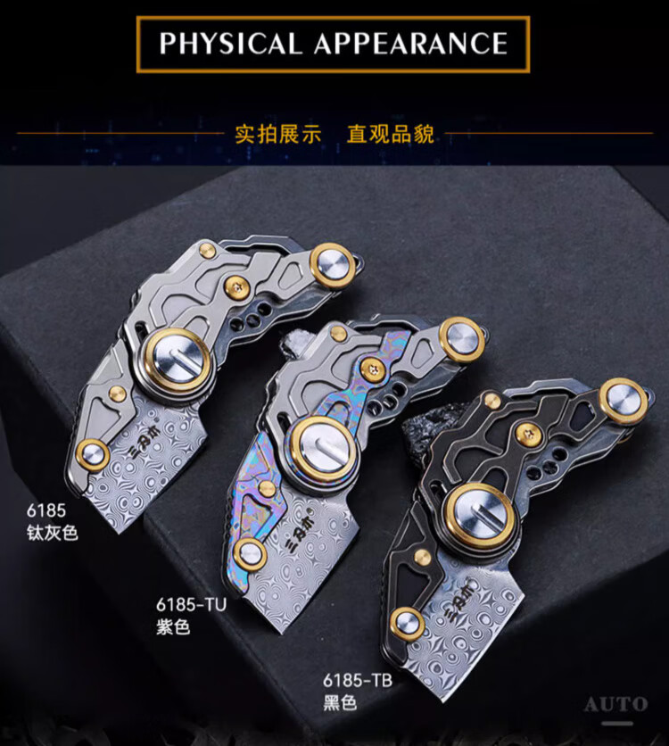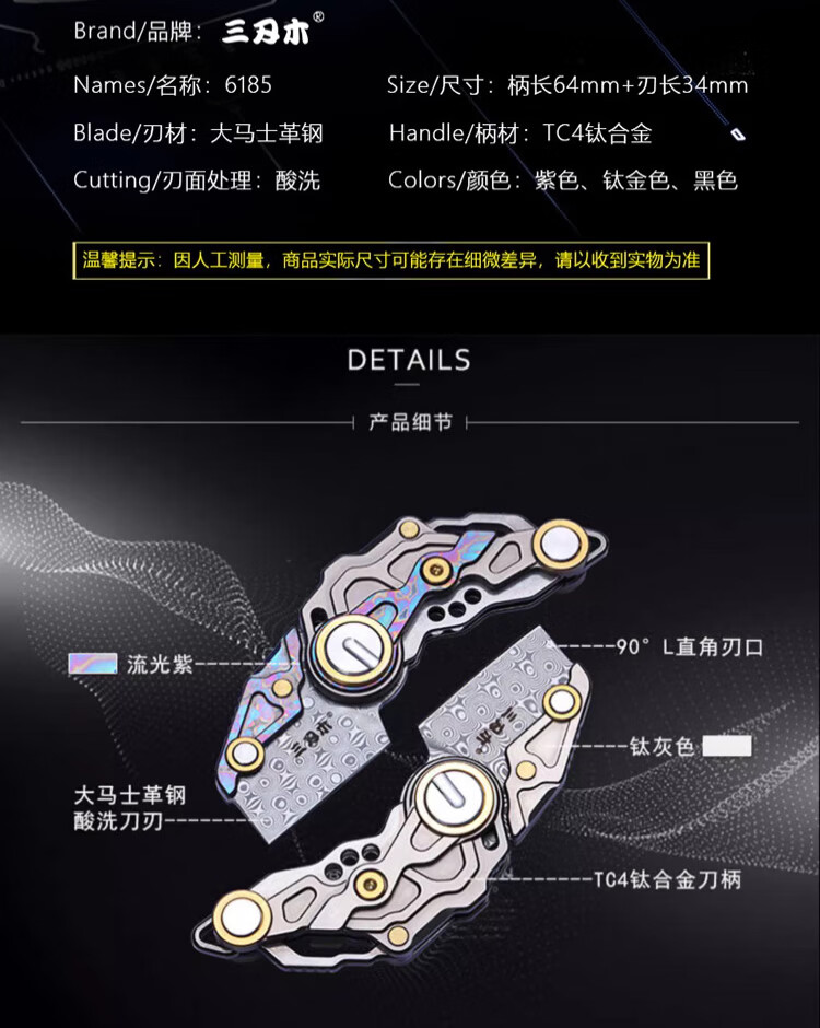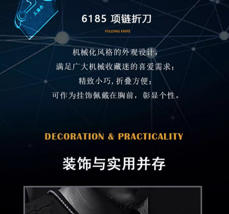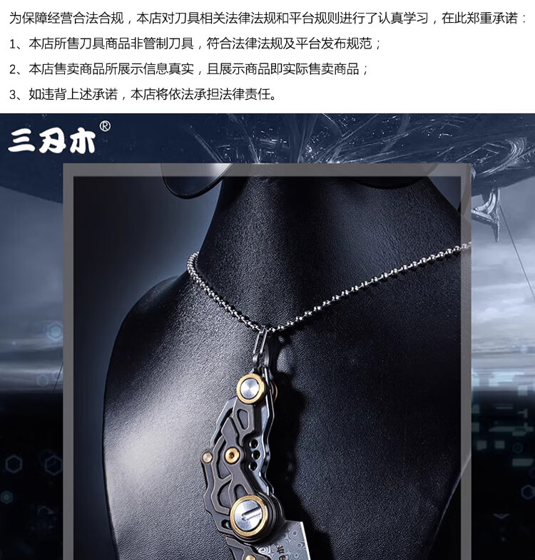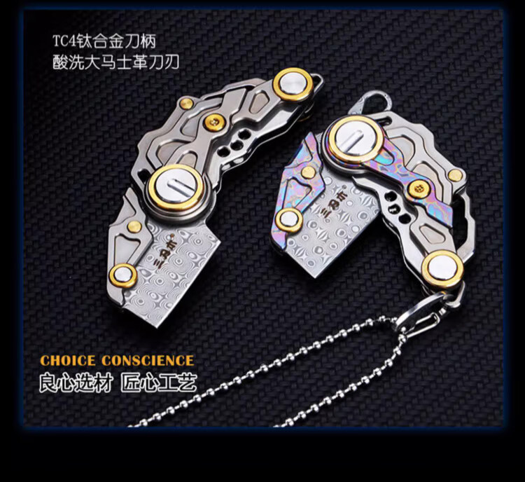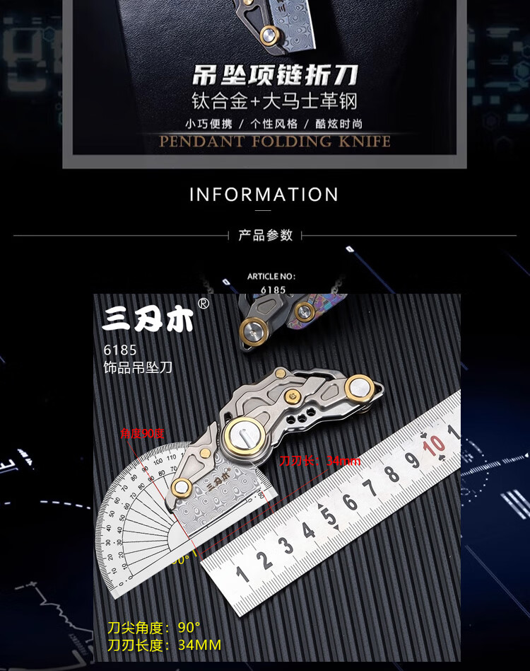 三刃木钛合金吊坠饰品小刀大马士革钢折叠刀防身锋利挂颈项链小刀 6185-TB-黑色