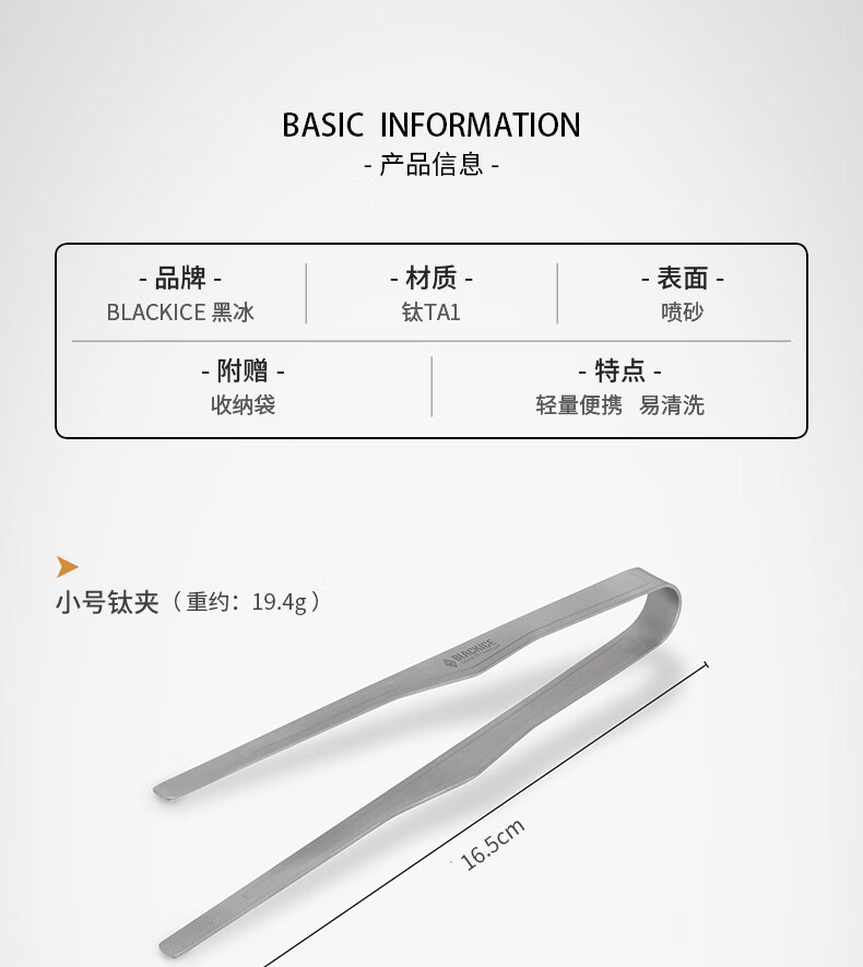 黑冰(BLACKICE) 黑冰户外多功能耐高温钛夹 轻量便携野餐烧烤夹 家用钛食物夹 钛色【Z7219G小号钛夹】
