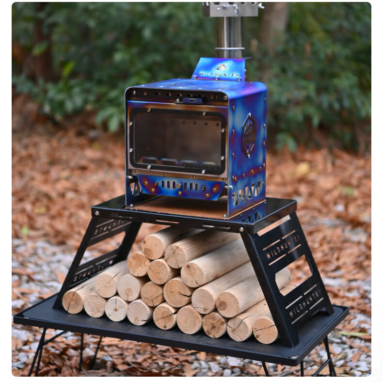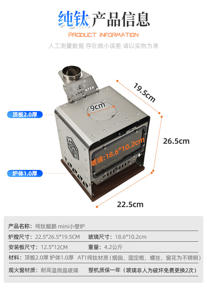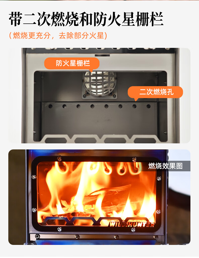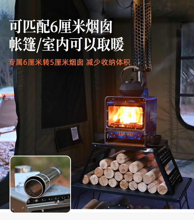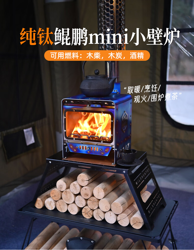 荒野猎人纯钛小壁炉观火户外露营超轻柴火炉帐篷室内取暖野餐炉 (纯钛)鲲鹏mini小壁炉--套餐四