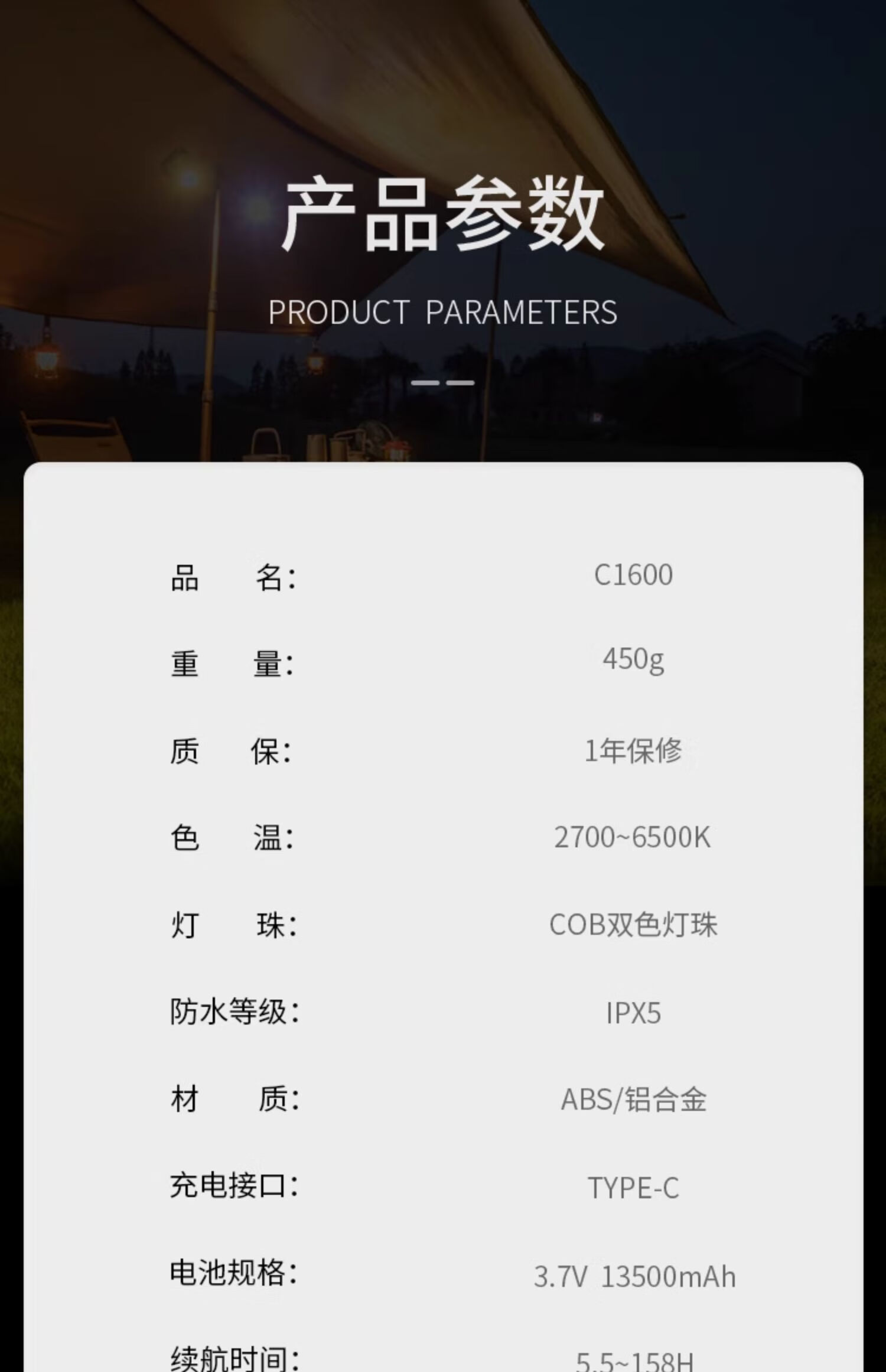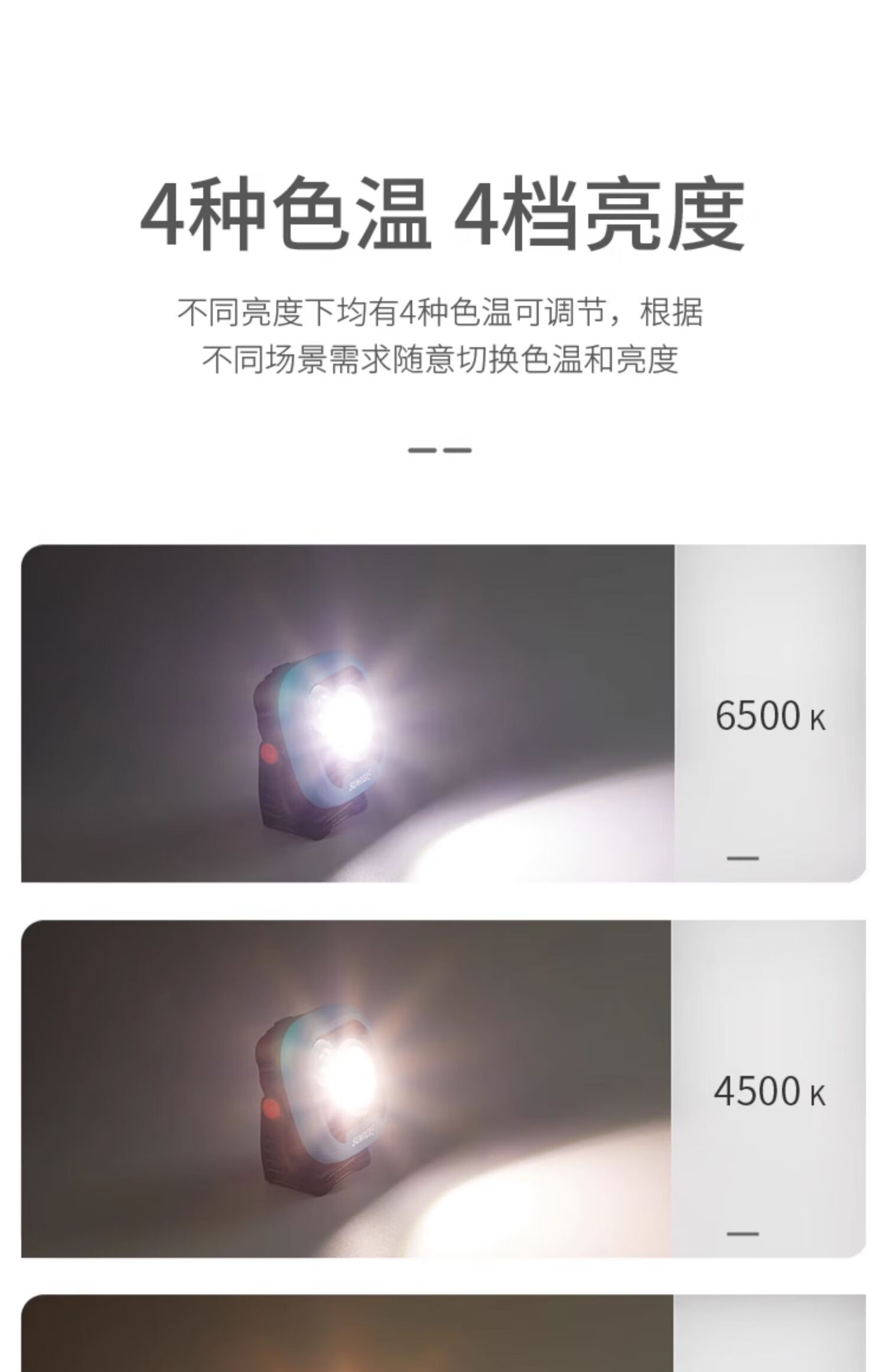 山力士这款户外露营灯,亮度和色温分别有四个档位调节,操作简单方便,做工非常得好,15000mah大容量电池能用非常久的时间,有磁吸和挂三脚架的螺丝口,方向可以360度调节,非常适合户外网上照明使用。