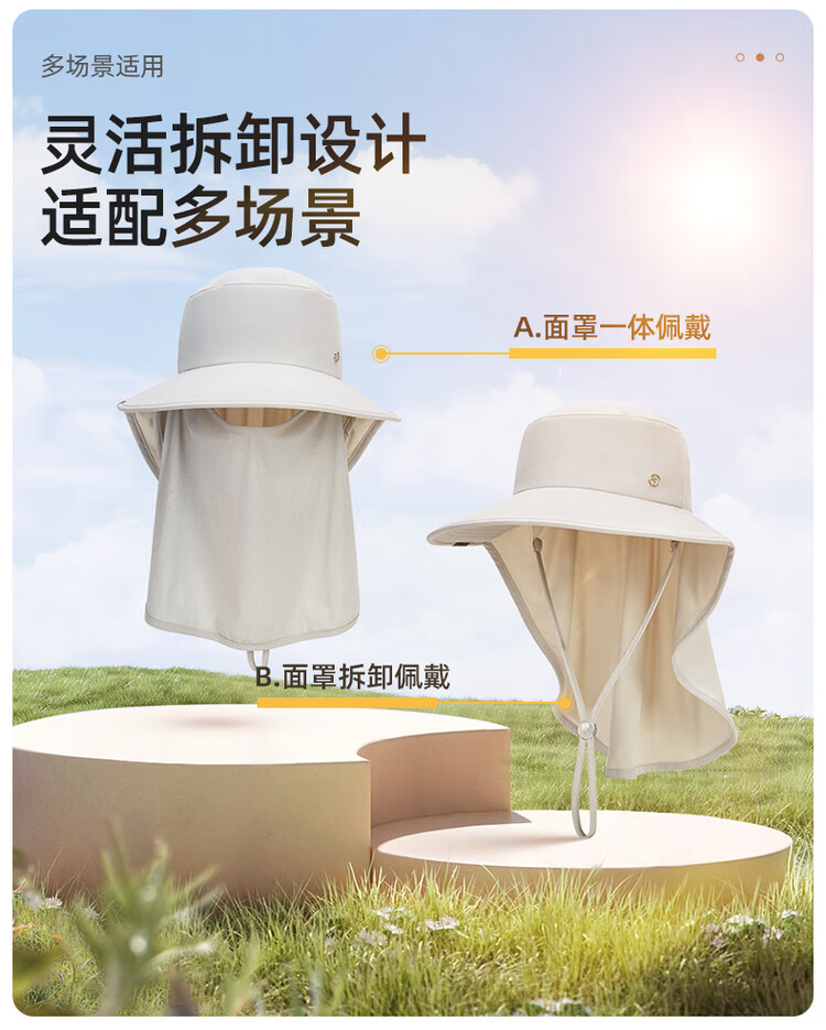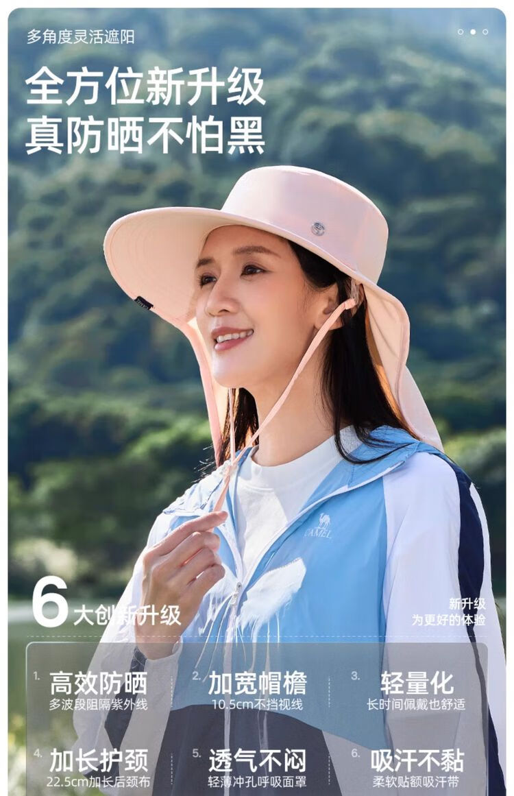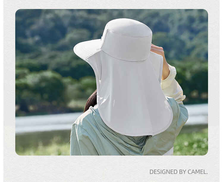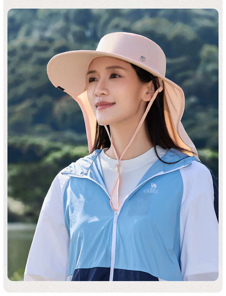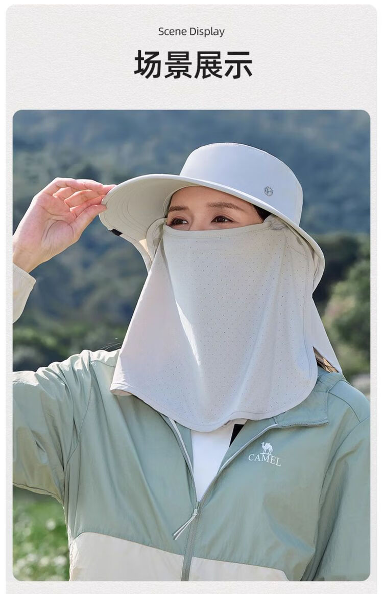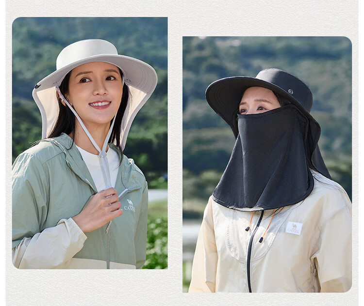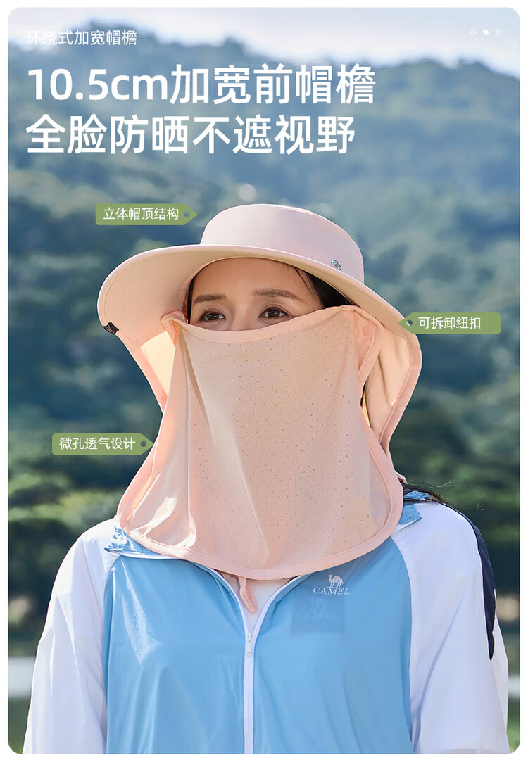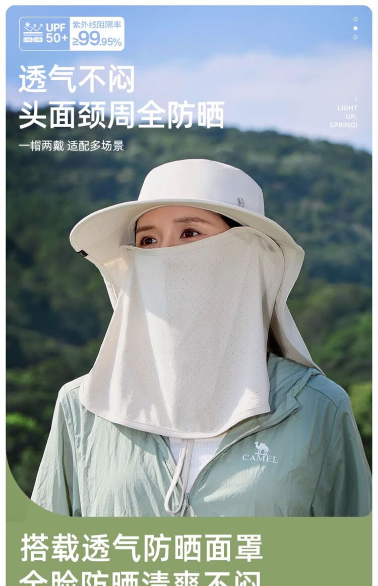 骆驼(CAMEL)全防护防晒帽子遮脸防紫外线夏徒步骑行运动遮阳太阳渔夫帽女 【全遮脸防晒】A1S3PX106A,米色 均码