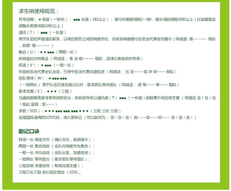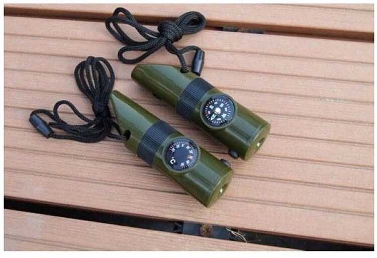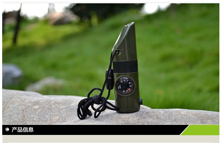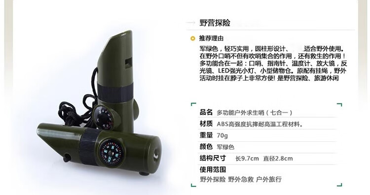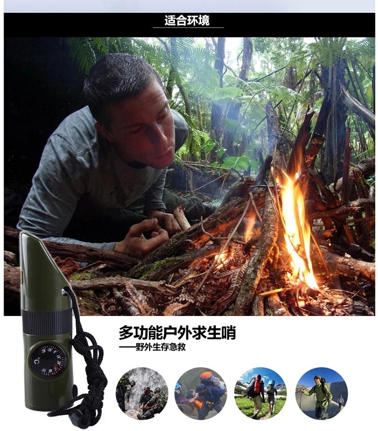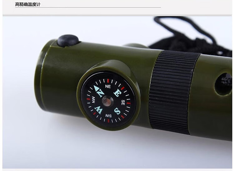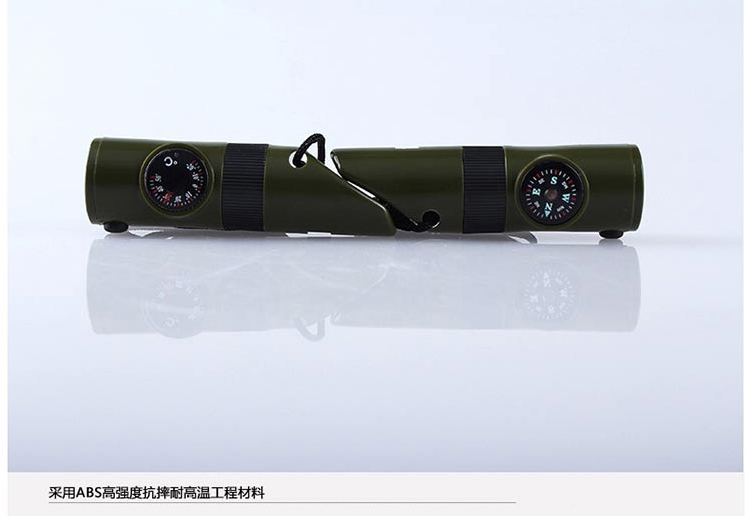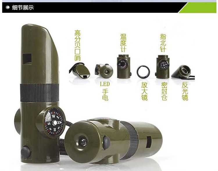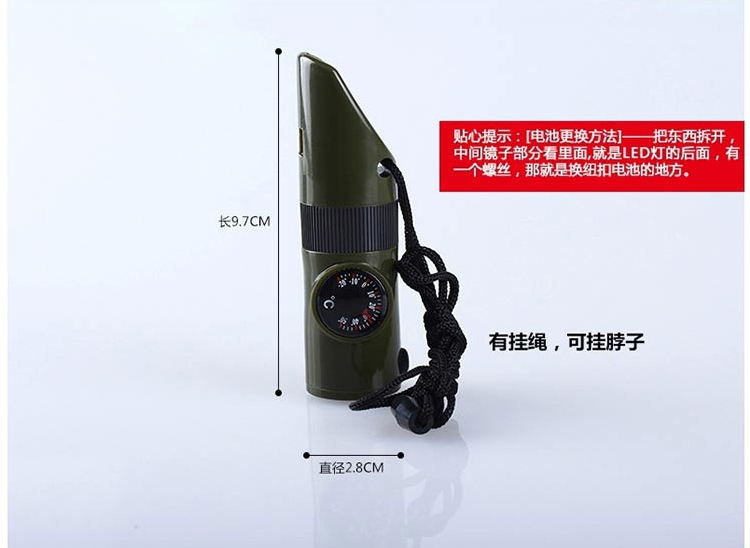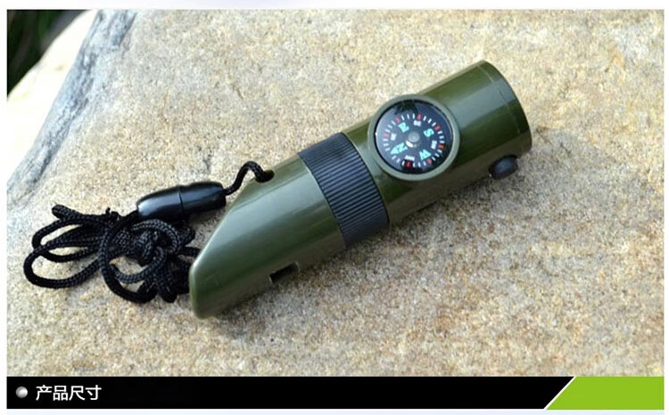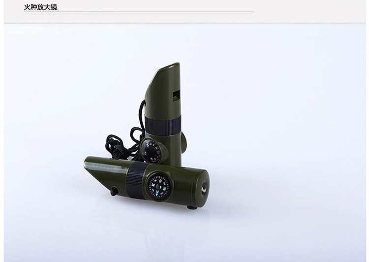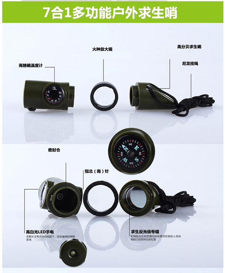 户外七合一救生口哨(指南针+LED灯+放大镜+口哨+反光镜) 野外生存哨子 军绿七合一