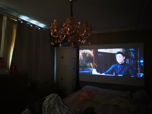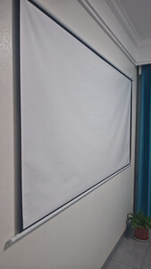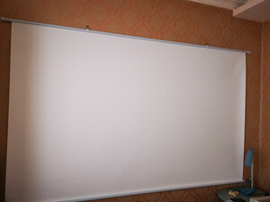 卧室没有白墙这个100寸幕布大小刚刚好,两边不够贴合稍微有点翘,下午三点拉帘效果,音响同步,画面很清晰,屏幕自重很轻,订了钉子挂起来了。幕布还是比以前打在白墙上清晰度高。
