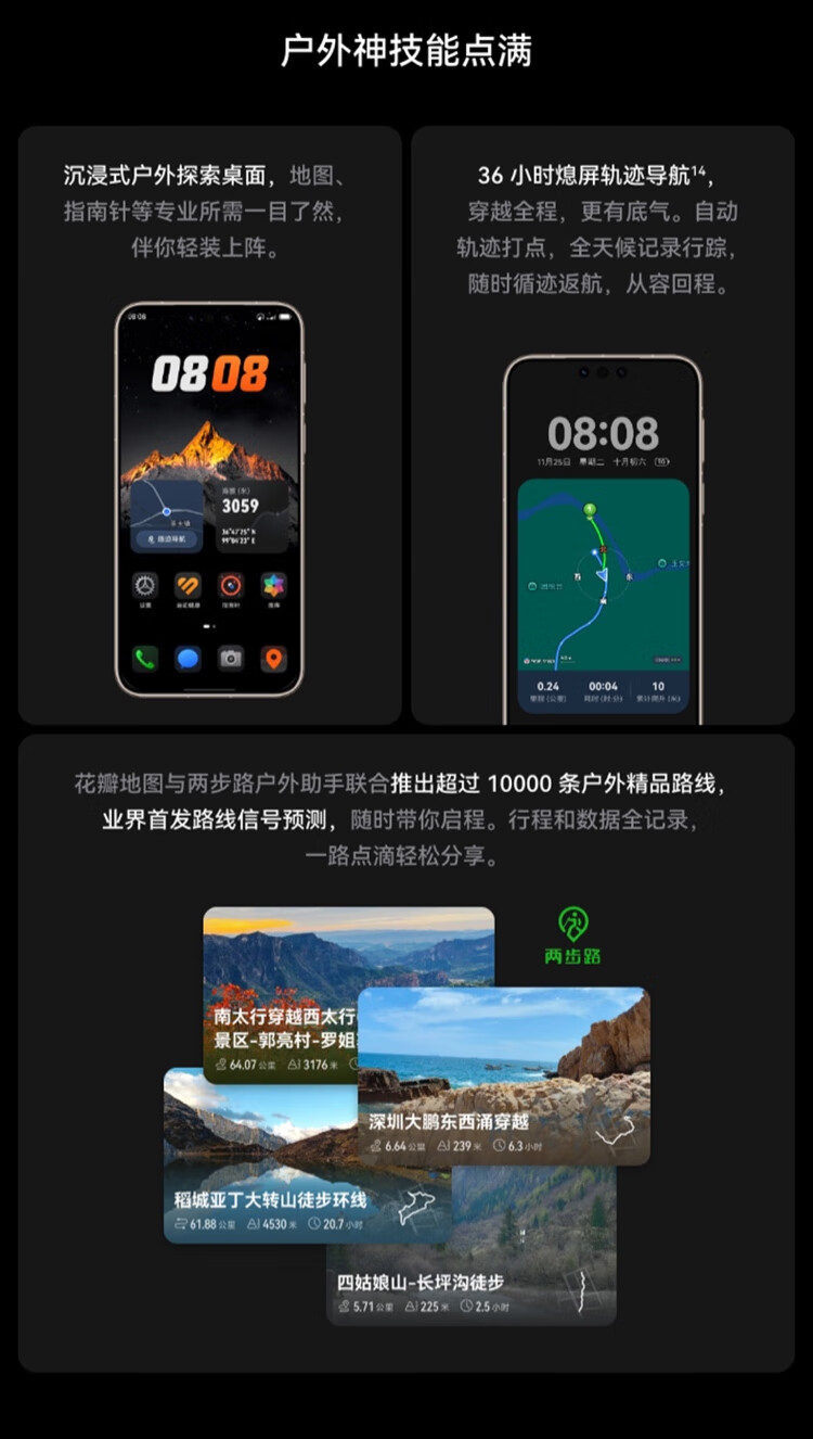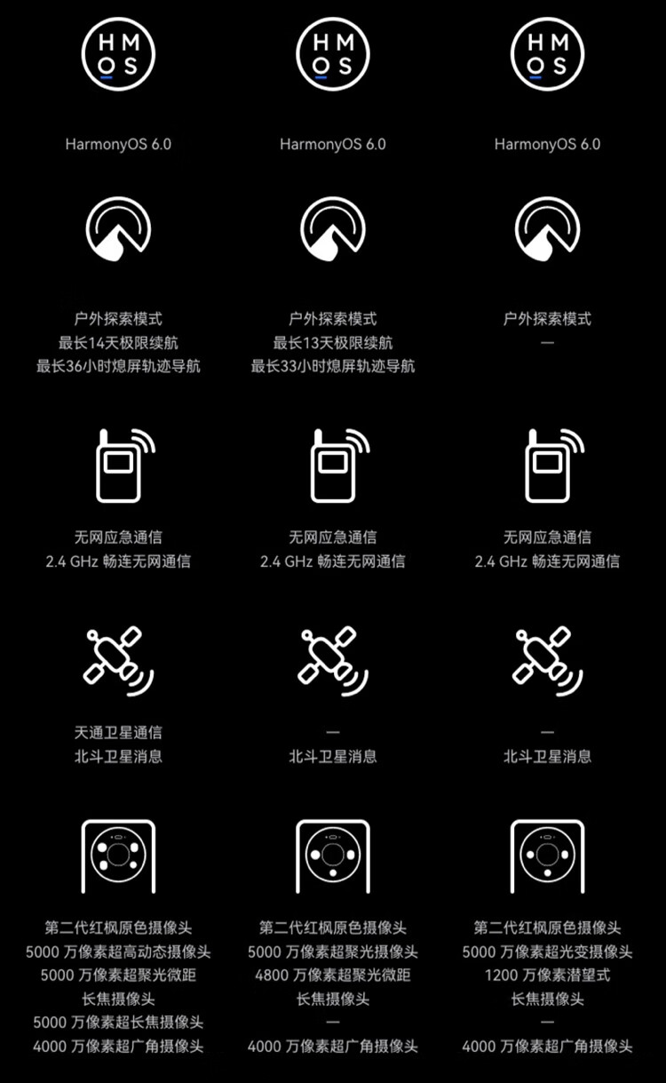 AI大模型,卫星通话,LTPO屏幕,高频PWM调光,全焦段影像,潜望式长焦,防水防尘,无线充电,NFC,红外遥控,大底主摄