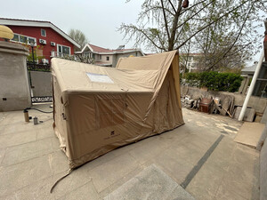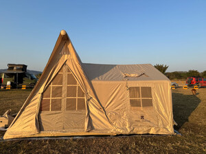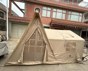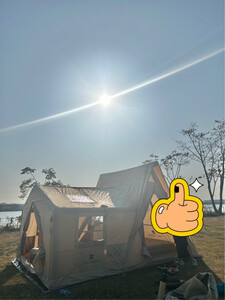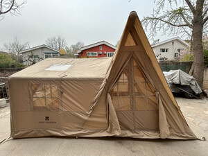 一分钱一分货,6000+的价格,比国内其它的帐篷确实好。一分重量一份质量,近80斤的重量决定它的牛津布的密度和厚度杠杠滴。 1.搭建挺容易,一个壮男就能搞定。配套的牧高笛电动气泵(吹气口可以卡在帐篷进气口上)压力不行,只能把气柱吹到半立;还要用帐篷自带的手动打气筒打40+次,把气压打到绿色的7.5就行了。 2.撤收快,2个人,打开气门,2~3分钟放气,然后用电动气泵抽完余气。对折再对折(4折),边裹边挤压余气,最后套上袋子完毕。全程不超过10分钟。 3.遮光隔热性好。从中午到太阳落山,小朋友们都喜欢待在帐篷里玩,我自己也觉得在帐篷内,比在某些国产的天幕或帐篷下凉快。 4.颜值挺好。内行人看品牌(比如雪峰),外行人看颜值。露营地里,就这一个鹤立鸡群的木屋式帐篷,确实挺独特炫酷的。来参观的人不少。 5.防潮保暖性好。帐篷自带封闭式防水垫,在铺上8mm厚的防潮垫,最后野餐垫或者地毯。在晚上基本没有潮冷感。 6.密封性好。帐篷的窗户和门都带纱帐,能完全密闭,不怕蚂蚁等虫子爬进来。 7.细节挺足。帐篷内的挂点很多,方便自己搭配。窗户的遮光布,可以裹起来卡在窗户边缘,省去捆扎的麻烦。