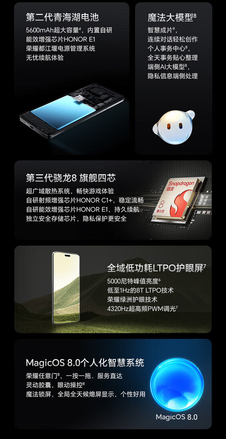 荣耀新款honor/荣耀 Magic6 超动态鹰眼拍照巨犀玻璃第三代骁龙5G手机 绒黑色 5G通_16GB+512GB