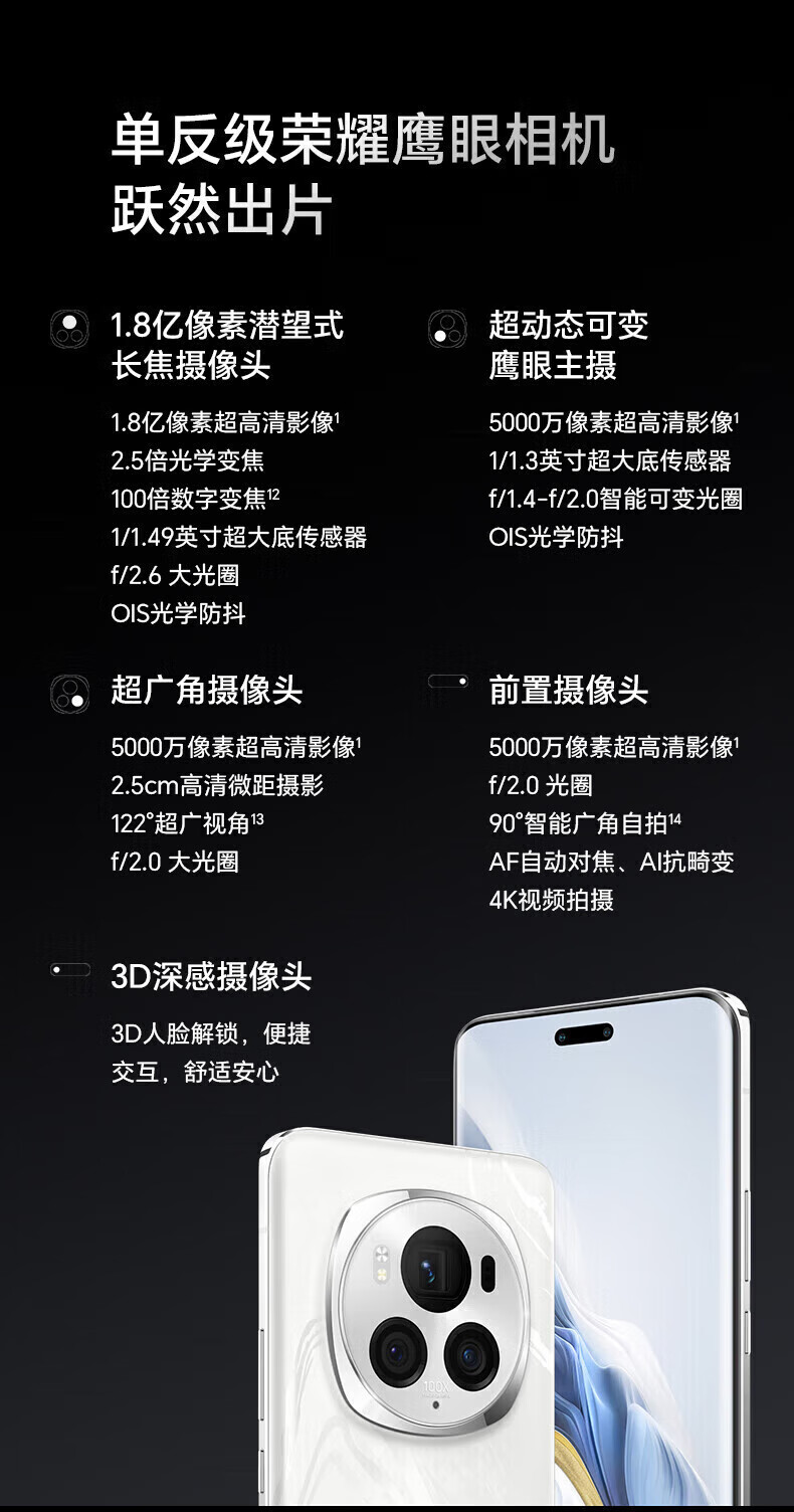 AI大模型,卫星通话,LTPO屏幕,高频PWM调光,潜望式长焦,防水防尘,无线充电,NFC,红外遥控,大底主摄