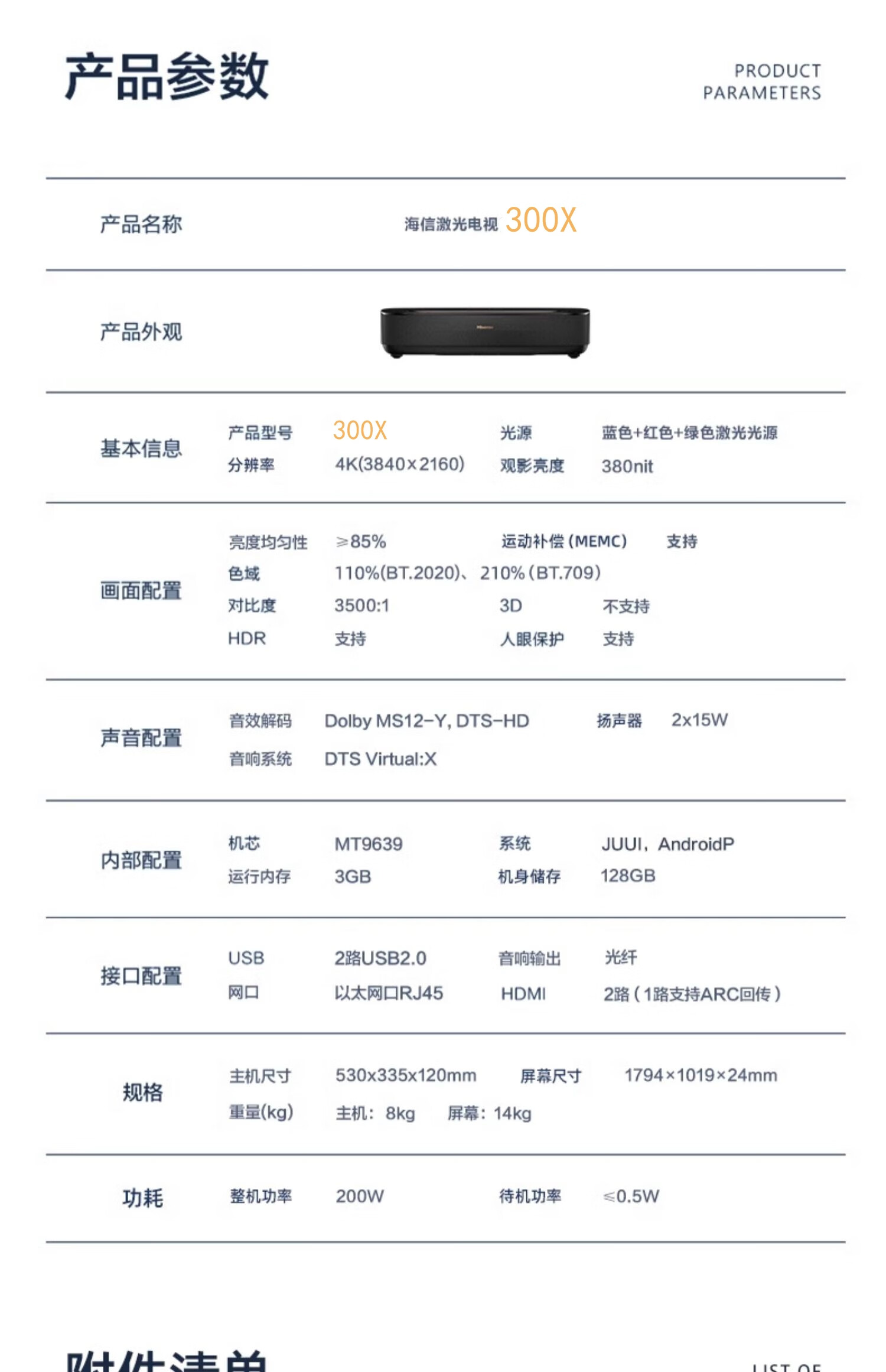 海信300X全色4K激光电视超高清家庭影院卧室客厅智能超短焦三色投影机 海信300X激光电视 单机