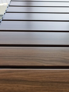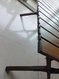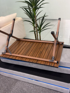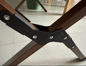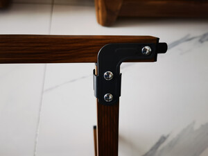 产品做工:整体做工给9.8分,基本上接近个人接受度里的完美。尤其是台面和桌腿等主要材质及地方,木纹效果也很突出。唯一有点瑕疵的是左边沿的黑色塑料链接卡扣,两端有一点扣不紧。个人建议在端头的处理形式上可以改良一下,避免塑料卡扣卡不紧,尤其是时间久了老化断裂,导致台面不能用的情况