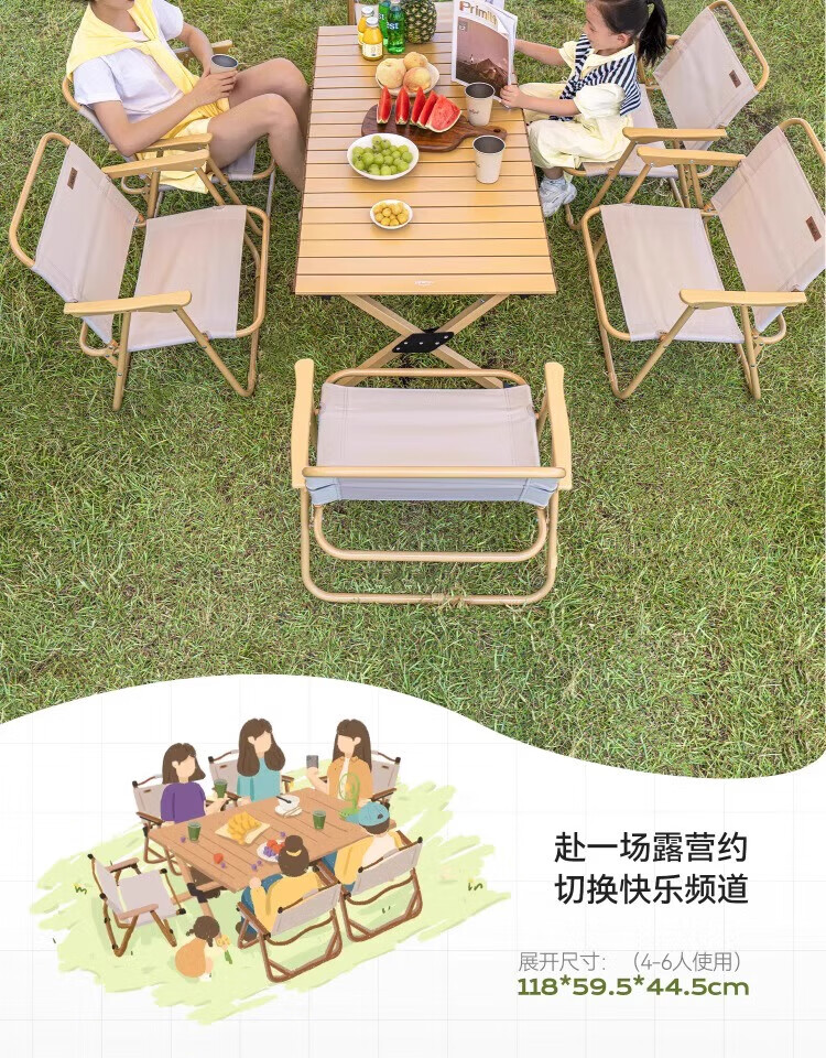 黑鹿(BLACKDEER)木纹铝合金蛋卷桌 户外露营折叠桌椅 便携式露营烧烤野餐折叠桌子 木纹蛋卷桌120款+宅宅椅玄米白*4