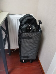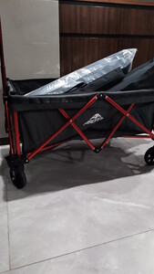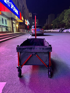 网上选了很多款,做了一定的功课比较,收纳起来很小巧,不占地方,推拉也很轻松。 车子的自身七公斤多,还好拎得动,想想如果买了其他款的,动辄是20斤就会显笨重了,下次露营可以带上推车,带上心爱的小宠物出去浪了。