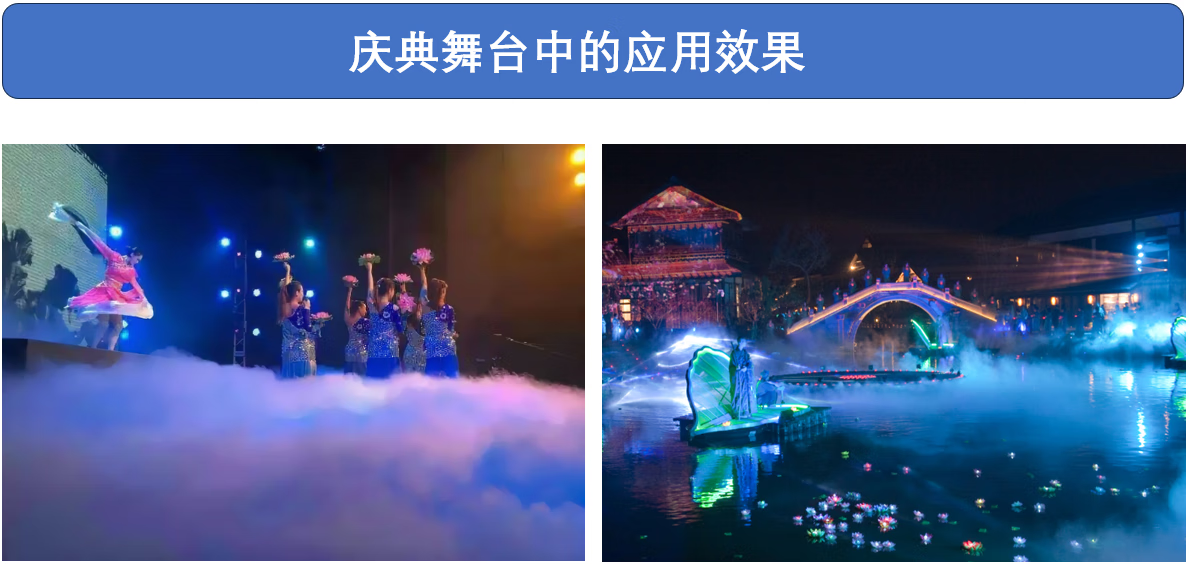 广泛用于舞台、剧场、影视、婚庆、庆典、晚会等制作云海效果,全国及全世界用干冰制作特效的经典剧目不计其数。