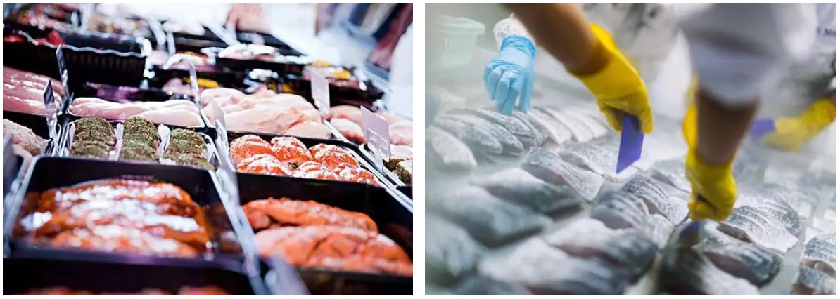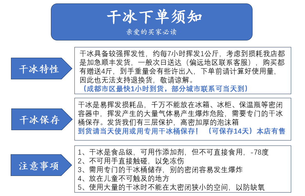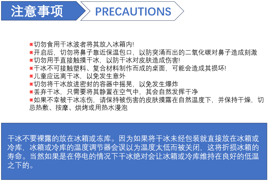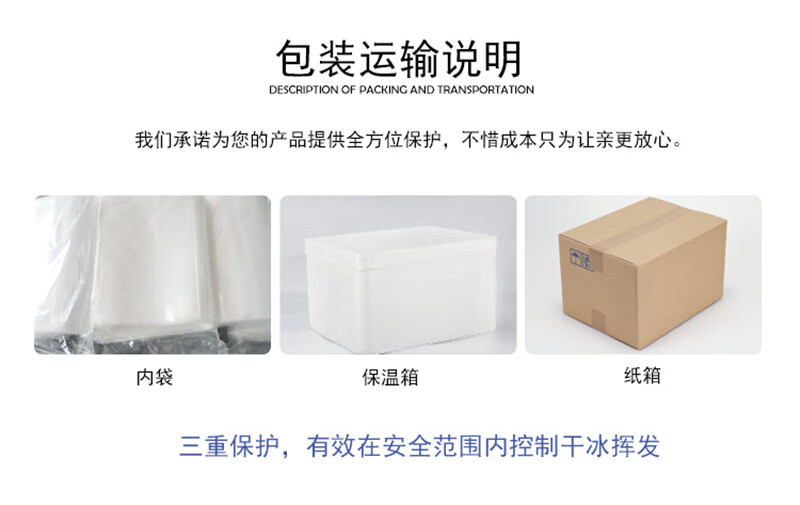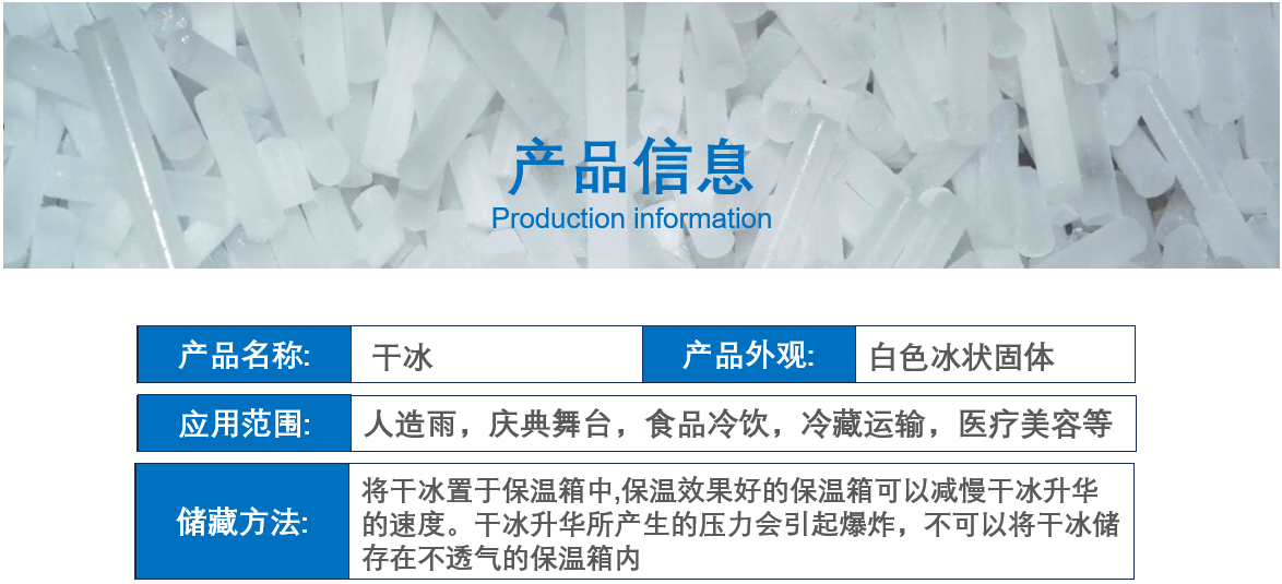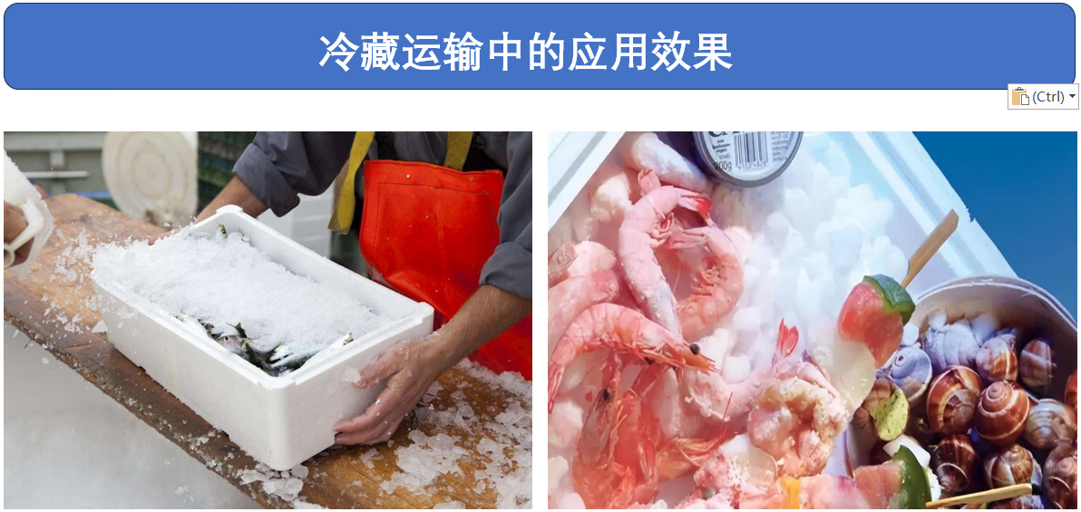 龙虾、蟹、鱼翅等海产品冷冻冷藏。干冰不会化水,较水冰冷藏更清洁、干净,在欧、美、日本等国得到广泛应用。