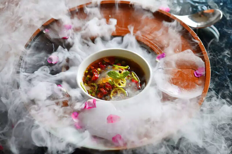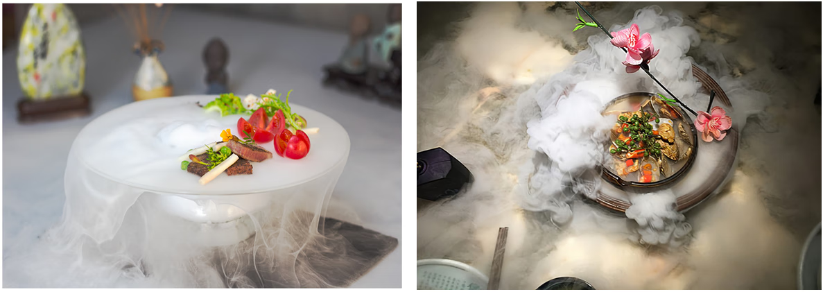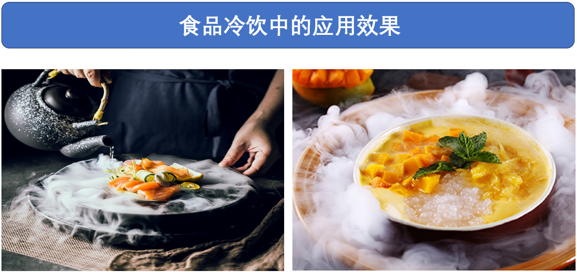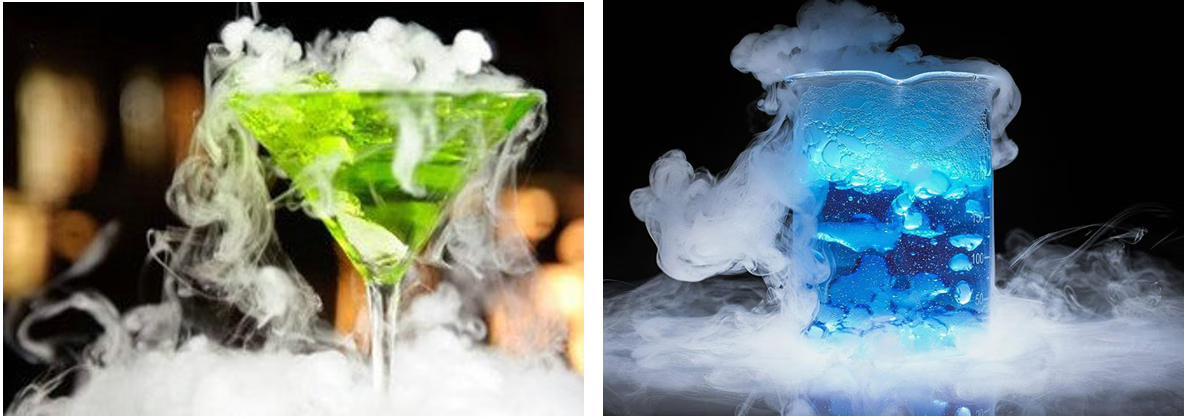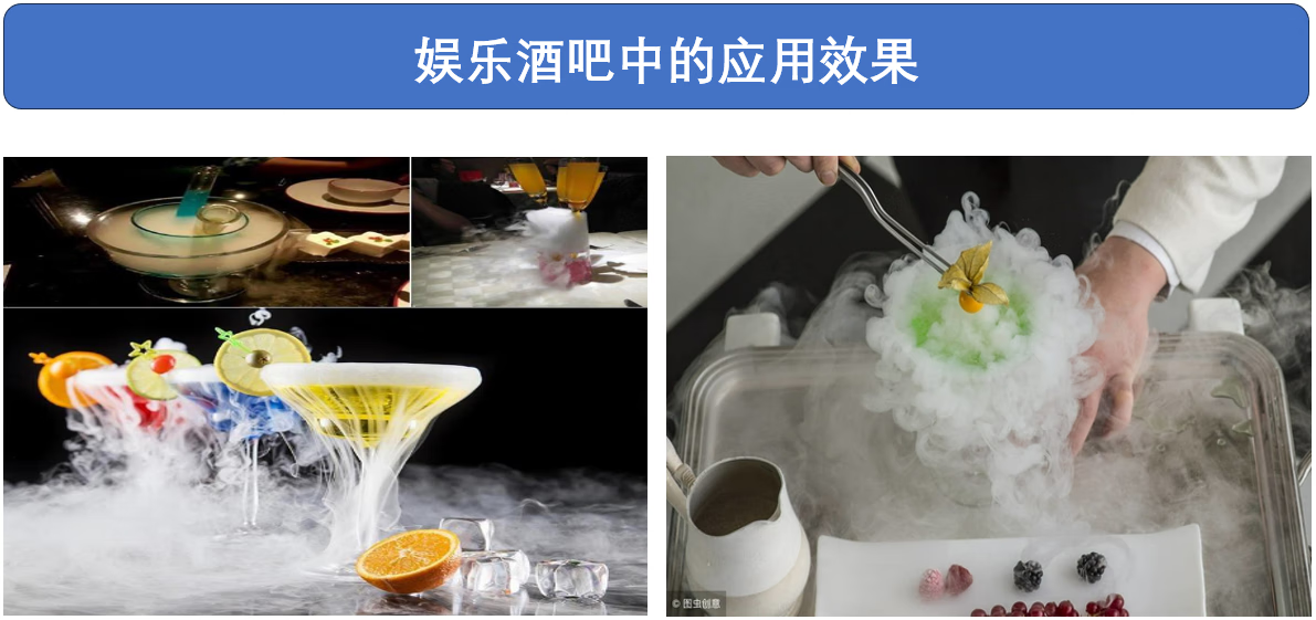 在葡萄酒、鸡尾酒或饮料中加入干冰块,饮用时凉爽可口,杯中烟雾缭绕,十分怡人