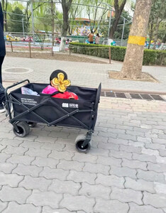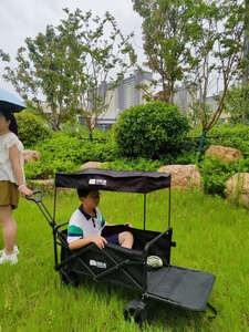 快递收到了,以为要安装一会儿,结果打开就能用,罩子一套就行,太方便了,收纳也超级简单,这车既能拖货又能拉载小朋友,后开门,在外宝宝困了还能睡里面,很实用。