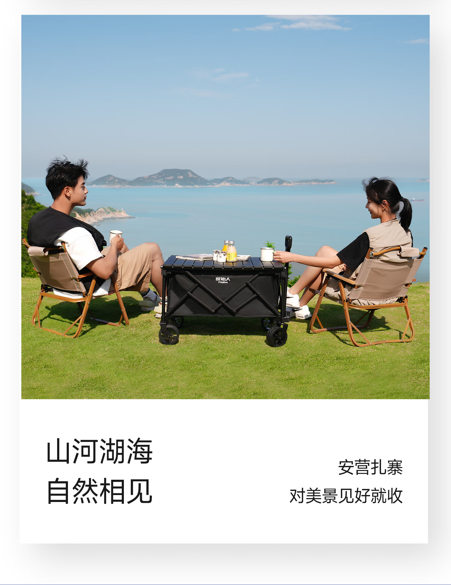 百蜜N+原始人露营车凭借其高承重、轻量化设计和多功能性获得用户好评,尤其合家庭及多人需营场景。1.核心优势1.超大承重与容量225kg承重能力可应对重载需求,后开款设计实现208L超容量,适合46人露营装备。13拖斗后开功能优化取放物品体验,无需顶部掏取,提升效率。2.轻量化与耐用性全铝合金材质减轻20%重量,耐用性达10年不生锈,打破国际品牌高价至断。14·600D双层牛津布抗斯裂性强0##3.便捷功能·自动回弹拉杆和高度调节设计,适配不同身高使用者。实心坦克轮应对复杂地形(沙地、碎石等)