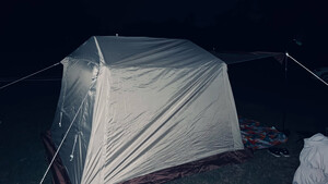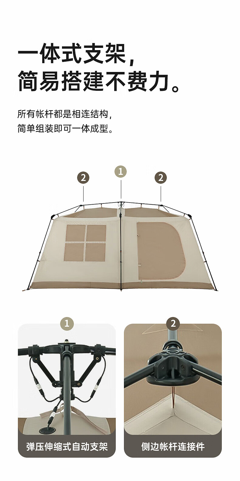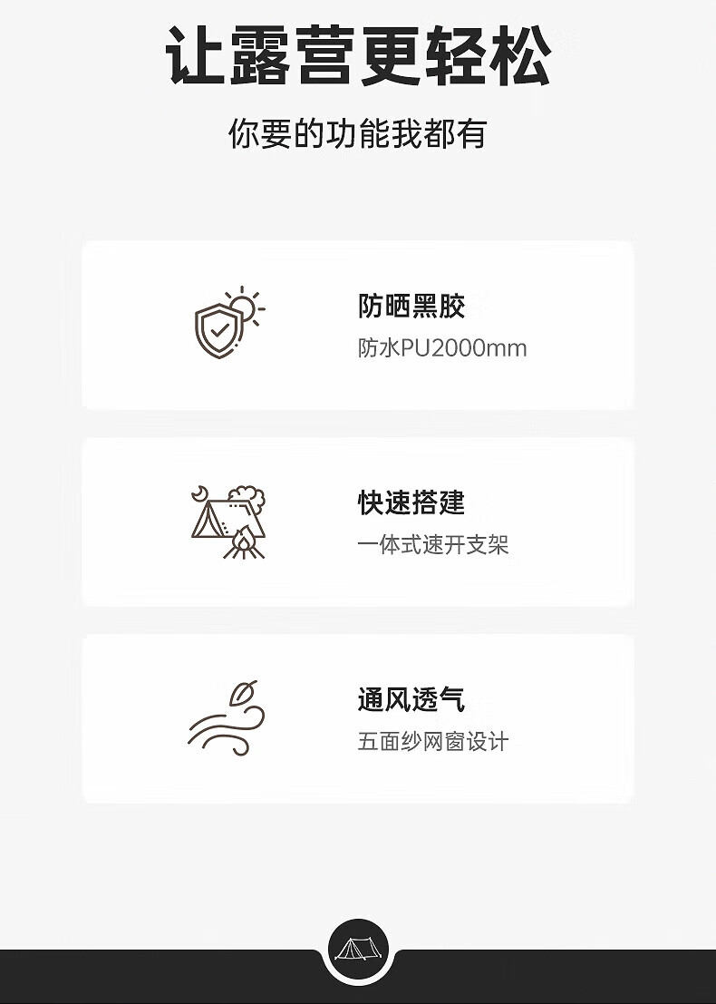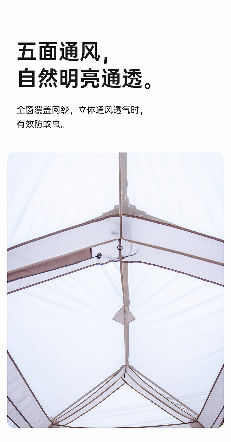 防水效果:挺好的,晚上把外账拉好,防风防水,里面很舒服 适用场景:户外露营很合适,遇到天气不好可以一直呆在里面。黑胶隔光效果非常好,不仅避免了尴尬,还防蚊虫往里铺。 容纳人数:4人轻松,13的尺寸适合家庭 透气效果:透气很好没有问题,上下都有纱网可打开 展开类型:屋脊骨架外置 便携性能:略重