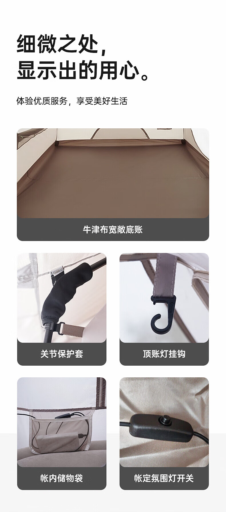 性价比真的很不错的,已经使用两次,在外面居住了两晚,空间真的大,避光性很好,爱睡懒觉的,不用担心第二天一早起来被阳光照醒了,收纳搭建也是非常方便快捷了,里面的灯带设计我特别喜欢,特别方便,不用自己带灯了,点赞,送的充气床,也很好,比我自己买的还要好。所以朋友也买了一顶。