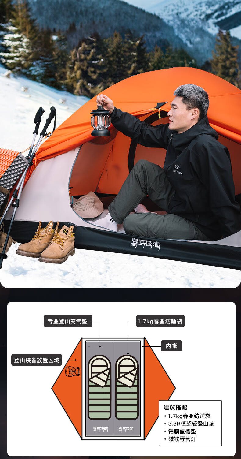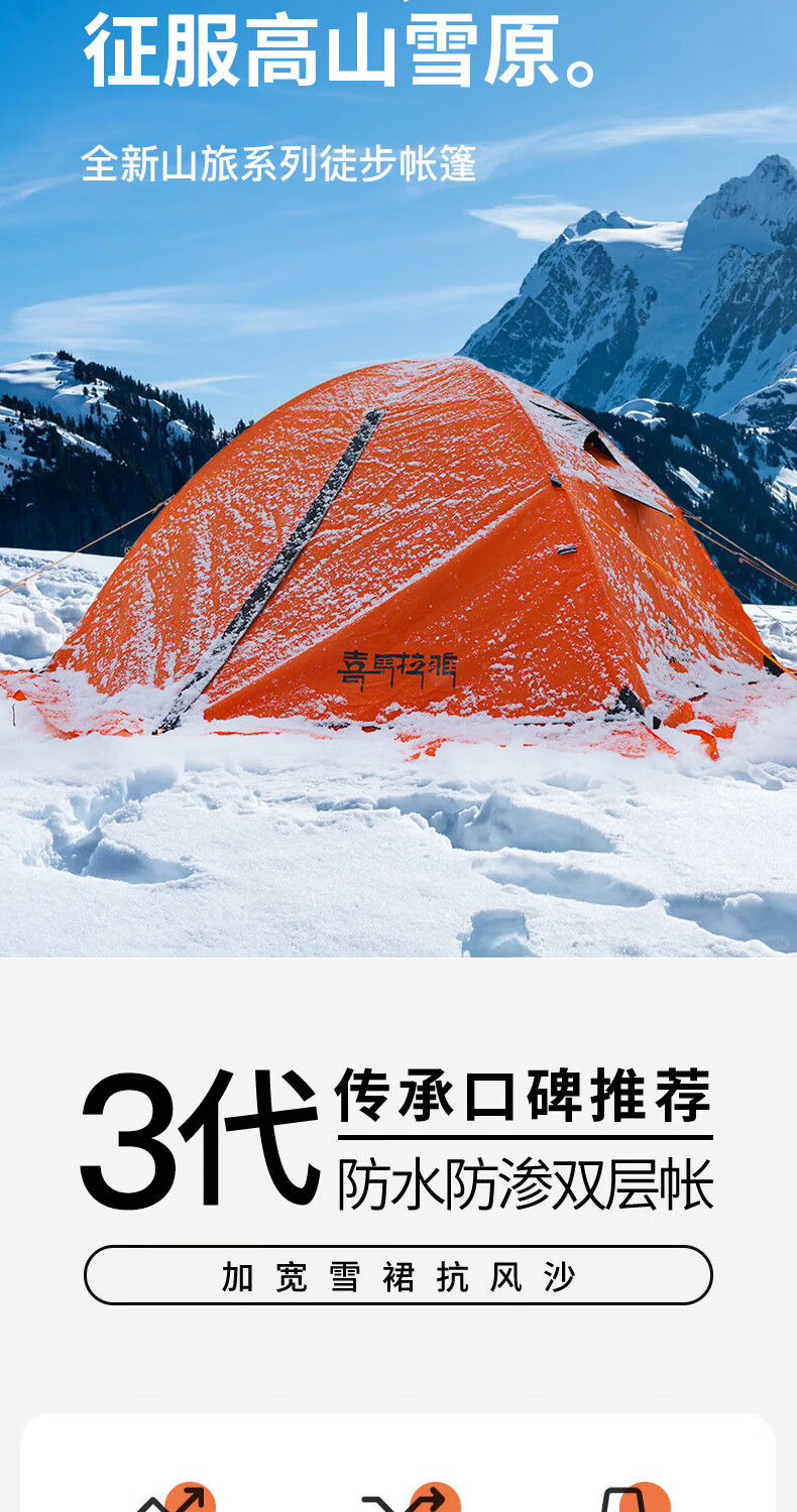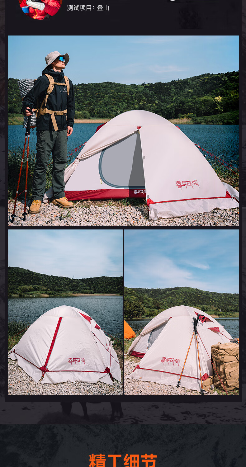 喜玛拉雅登山帐蓬采用210D牛津布制做,防水效果很好,不俱风雪。透气效果很好可容纳两到三人。易收纳便于携带,适用多种场景。