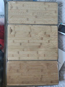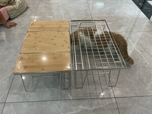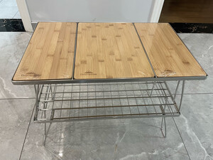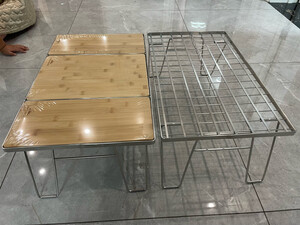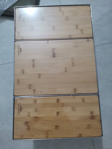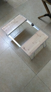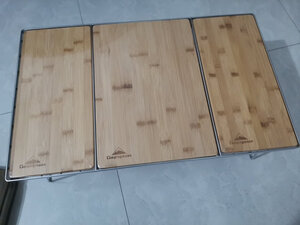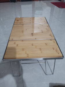 桌子质感很棒,细节做工也不错,拿到手里确实有点分量,桌子组合很灵活。席地而坐一张就够了。一个小凳子的话用两张叠起来,如果是大凳子就用三张叠起来。木板上面的木板就是那种竹子的,做工也挺好,唯一的不足可能就是重量吧,三张桌子足足有16斤,好在不是每次都需要带三张