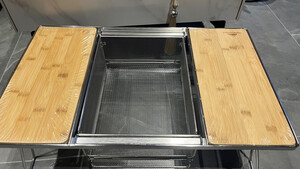 这是买的第6张柯曼桌了,前面买了两张不锈钢的三张铁网的,就差一张茶桌了。不锈钢茶桌可配沥水篮、水槽加盖板,也可以配一单元蜘蛛炉板,随心所欲搭配,可玩性高,配合三角板随意组合,太喜欢了,周末带出去用上了。