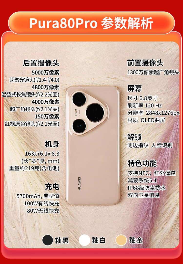 AI大模型,卫星通话,轻薄,LTPO屏幕,高频PWM调光,全焦段影像,潜望式长焦,防水防尘,无线充电,NFC,红外遥控,大底主摄,等深微曲屏