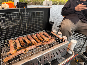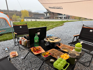 露营用着很方便,几个玻璃瓶放调料,塑料瓶子放洗洁精和油之类的液体,收纳很方便,网兜一装就全拿走了。