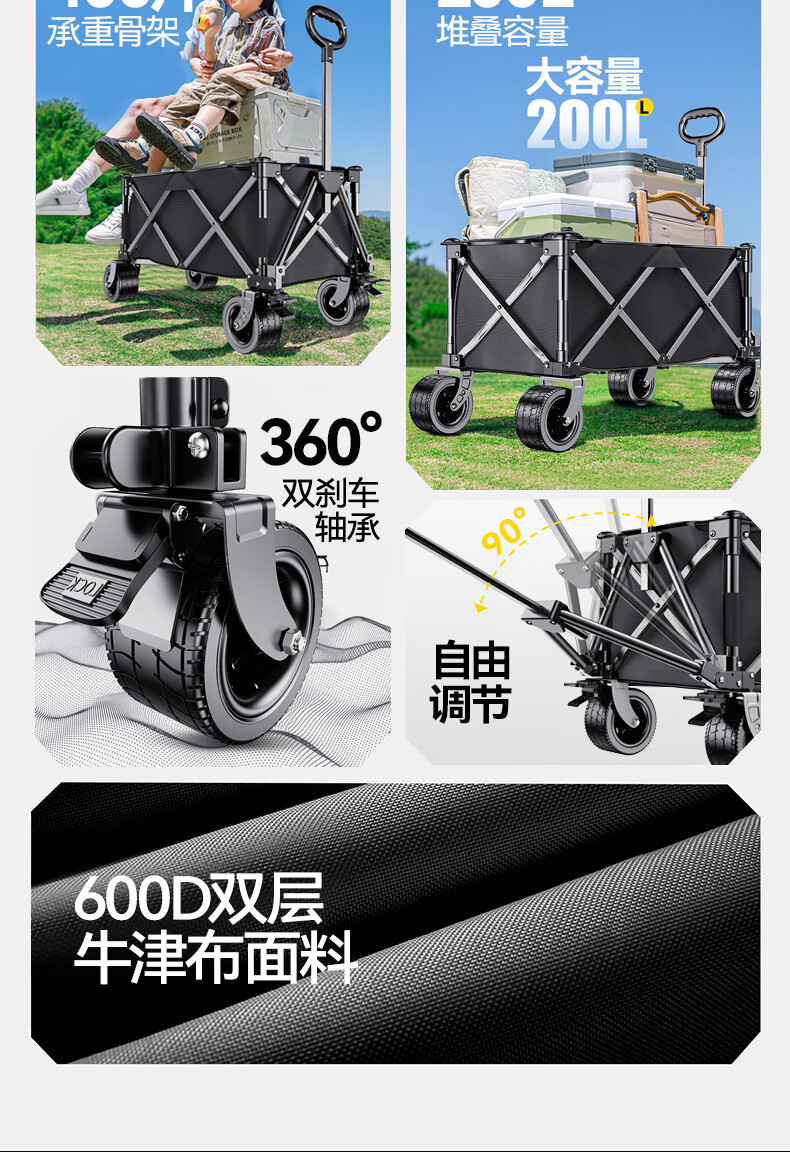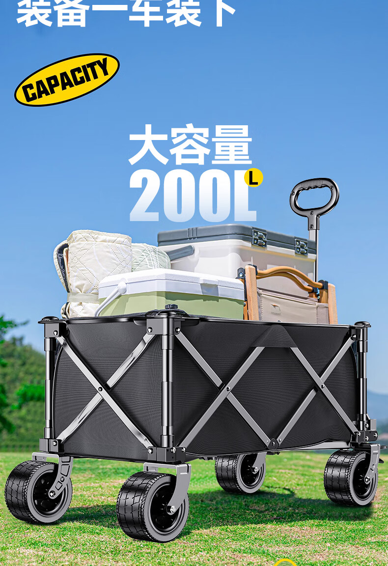 原始人露营车推车户外营地拖车超大折叠手推野餐野营手拉车遛娃小拉车 160L 双刹车万向轮聚拢款-典雅黑