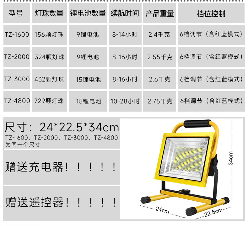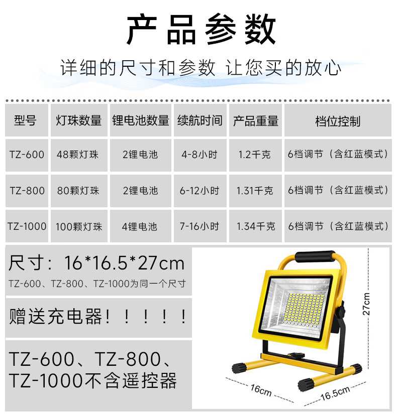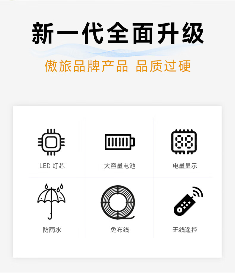 特色功能:很适合夜市小摊,野外露营,提供停电时候的照明所需 亮度很高很好用,有红蓝灯光作为警示功能,续航能力也很不错,材质做工:铝合金材质的,很结实。有遥控器也方便使用 设计风格:外观也很好看,很满意