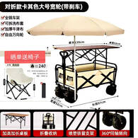 拖斗后翻露营地推车可折叠户外手推野餐车小拉车升降桌摆摊小推车 卡其色 150L 有刹车 加高桌带伞