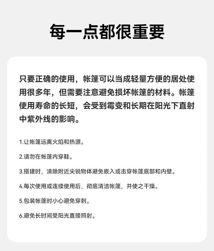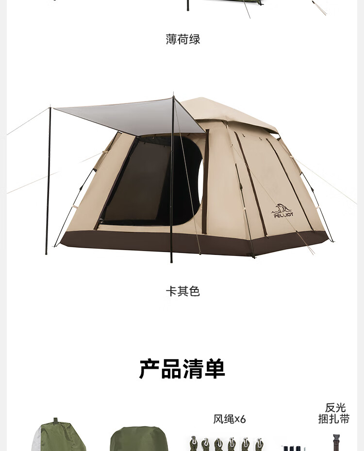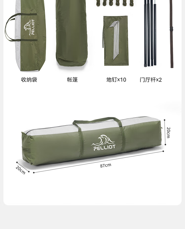 帐篷*1 收纳袋*1 地钉*10 风绳*6 反光捆扎带*1 门厅杆*2