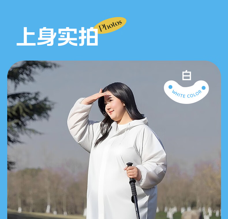 白色超级漂亮,很适合户外,雨衣的材质厚实,尺码也大,比我在其他家买的大码雨衣更大一点,而且质量也好,不像有些劣质雨衣一扯就破,特别满意