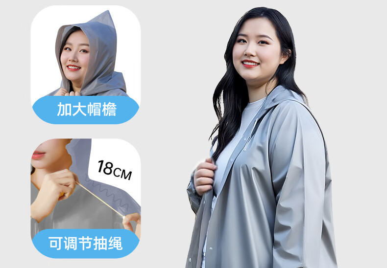 很宽大也很厚实,特别适合追求宽松或者胖胖的,而且帽檐也长,非常nice,挡雨更全面,拉绳的好调节领口,折起来小,方便携带,外出暴雨也不会淋湿脸!外出带很方便,质量非常好,可以反复使用