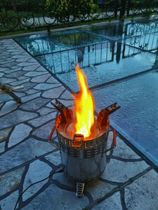 能用柴火也能用气。使用起来十分方便。外桶不烫手。底部自带风扇。点火十分迅速。刚开始有点烟,着火之后就没有烟了。期待户外使用。