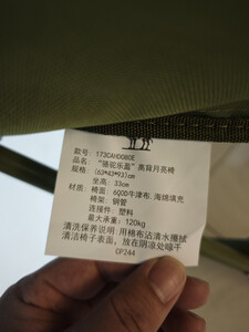 骆驼品牌,值得信赖,从外包装到里面包装,都有骆驼标志,牛津布,承重120公斤,户外活动和钓鱼可用,也可以在阳台用,坐起来很舒服,有头枕,可以睡觉,在阳台上乘凉,感觉一流,而且收纳方便,有黑色收纳袋,放在车上也方便,100块钱的东西,应该能用几年,塑料件和牛津布也就是这个寿命,性价比非常高,买骆驼不会差,其他品牌也懒得试了,直接上手骆驼质量有保障。