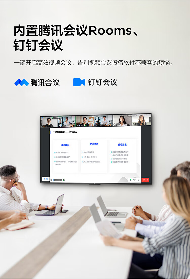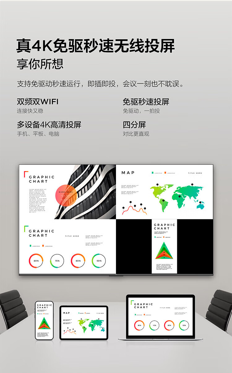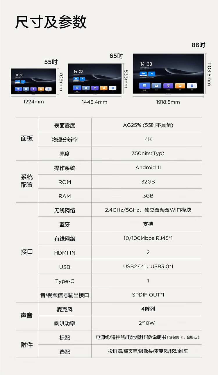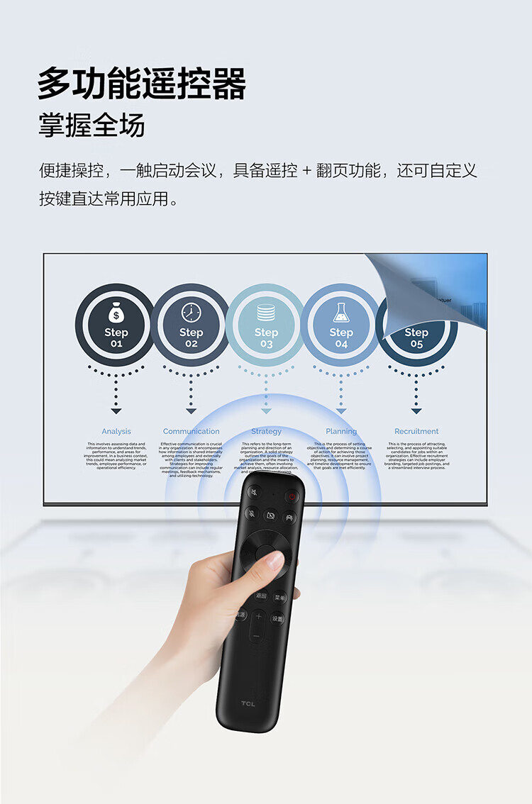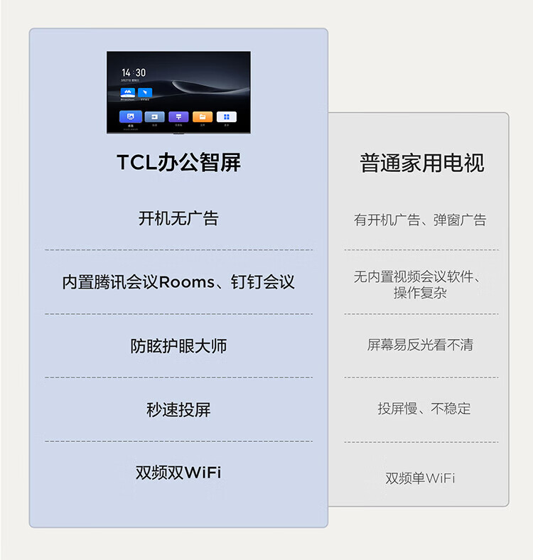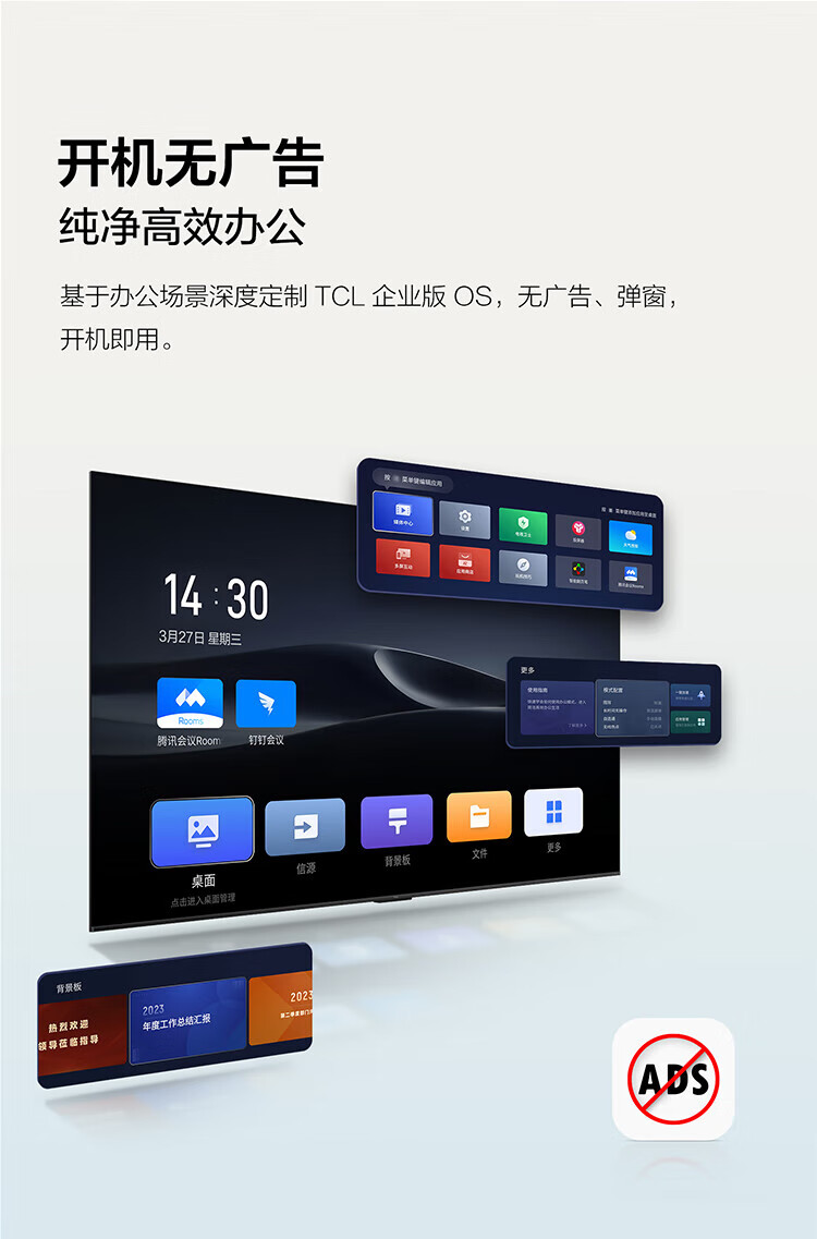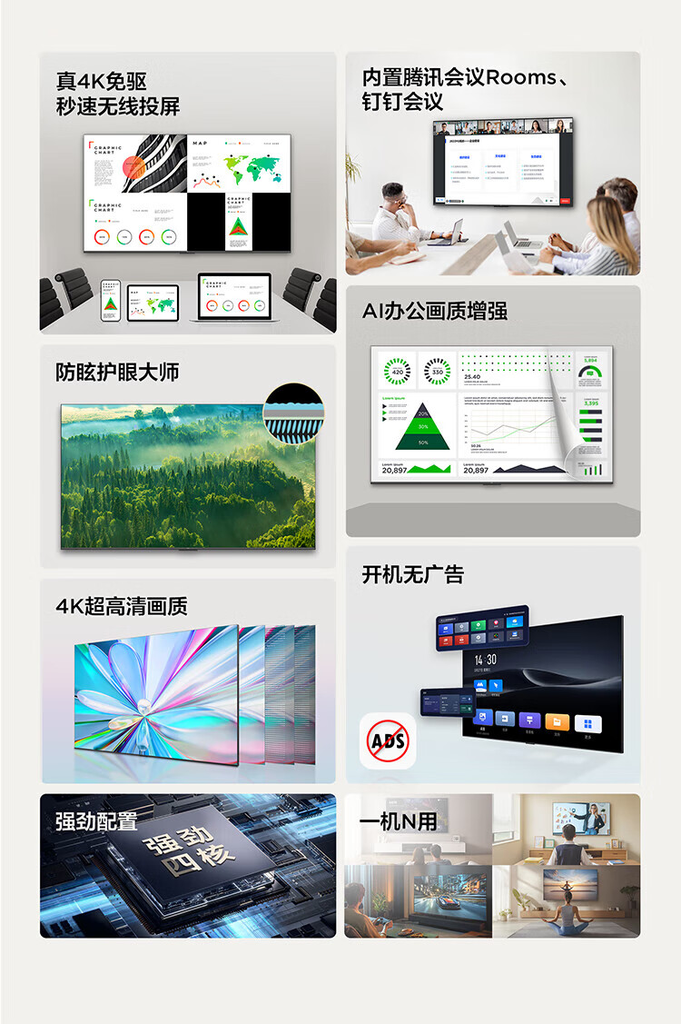 这款TCL会议机开机速度快,没有广告,支持电脑、手机、投屏器投屏等多种投屏方式,适合在企事业单位等商用环境会议中使用。