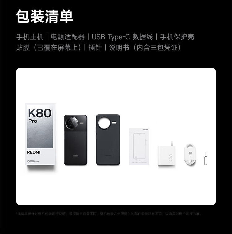 手机主机、电源适配器、USB Type-C 数据线、手机保护壳、贴膜(已覆在屏幕上)、插针、说明书(内含三包凭证)