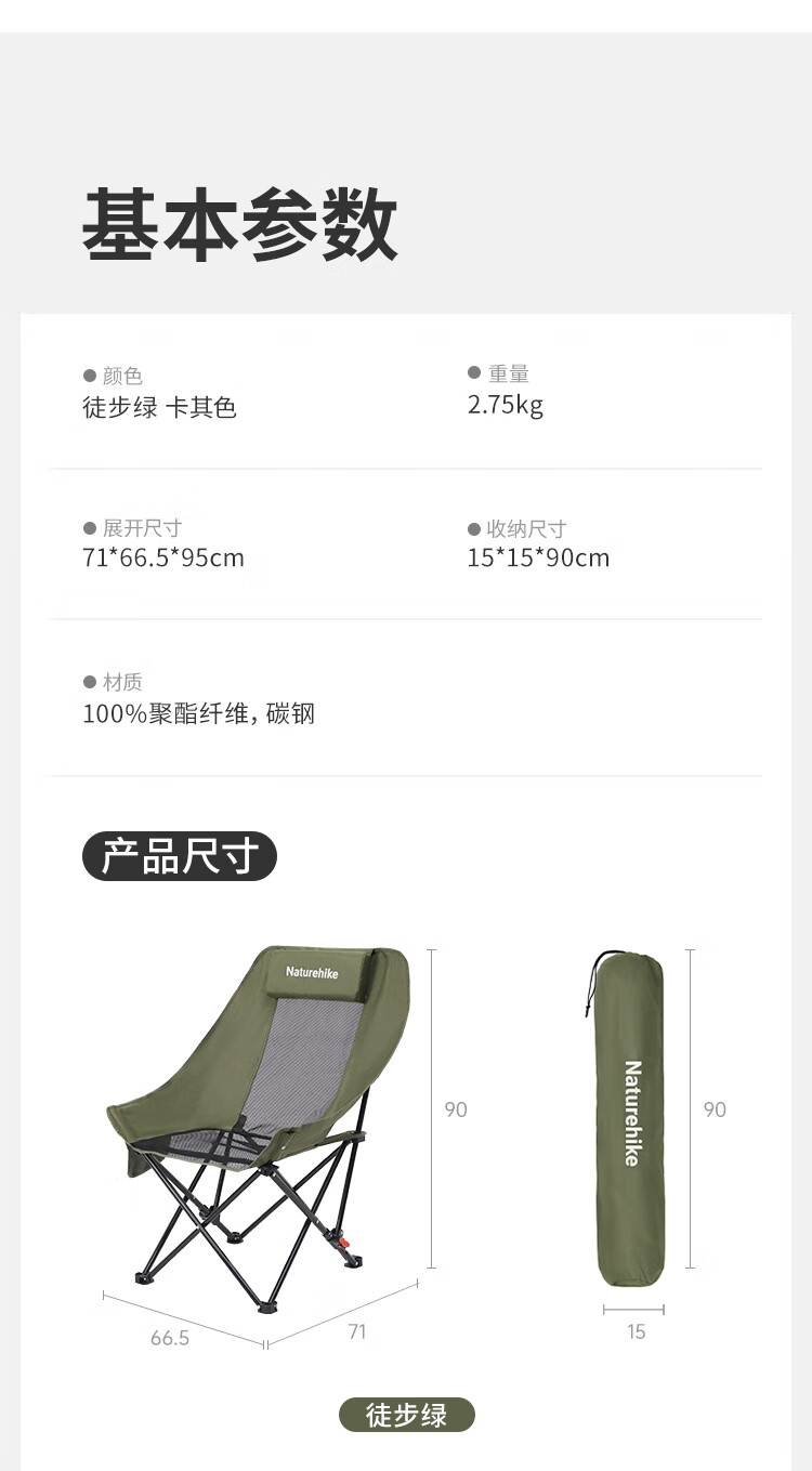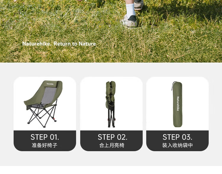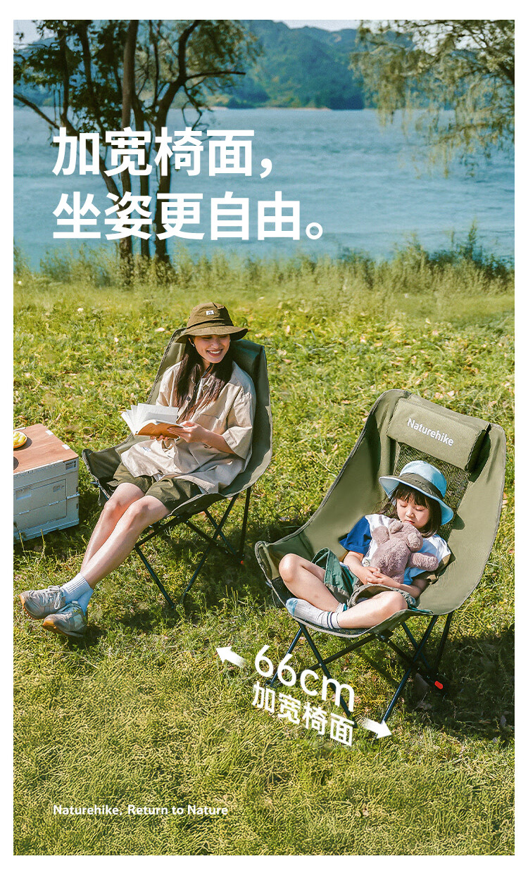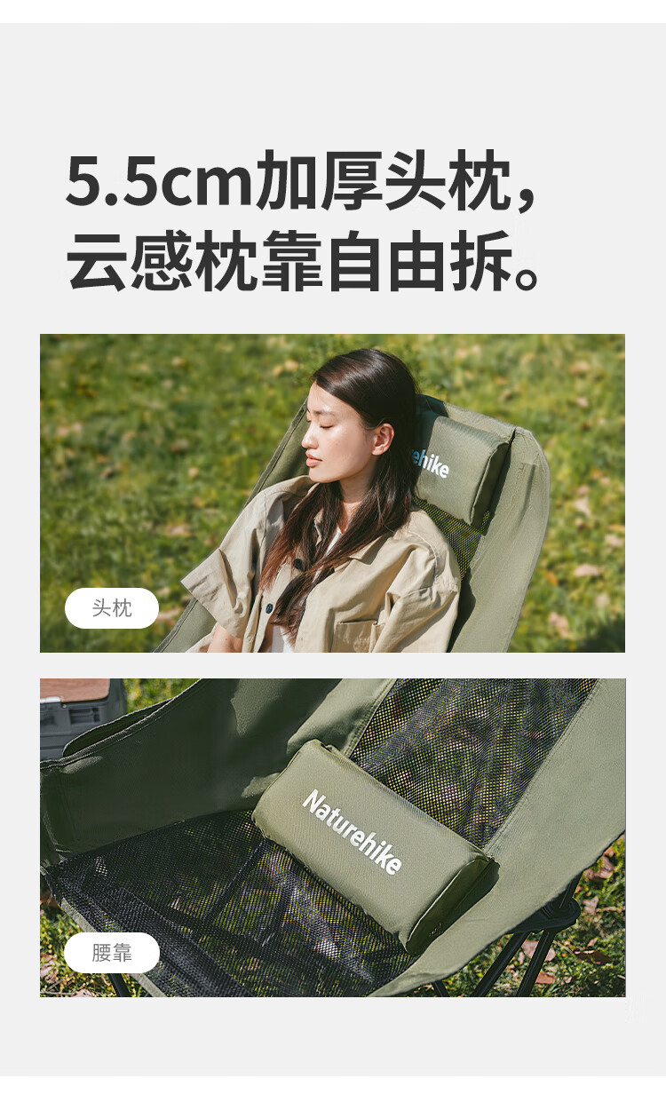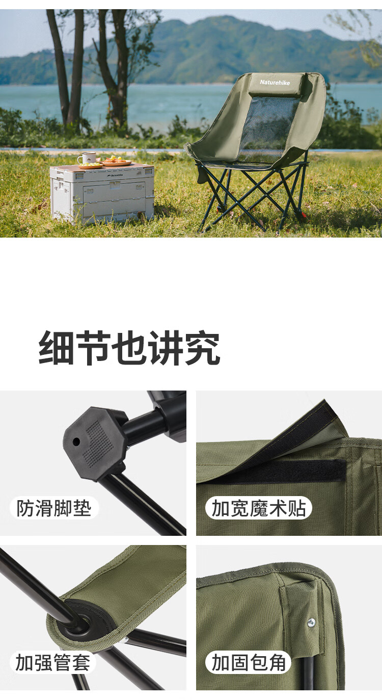 NatureHike挪客户外折叠椅高背网纱月亮椅露营可调便携钓鱼椅野餐坐躺椅子 徒步绿/网纱透气款