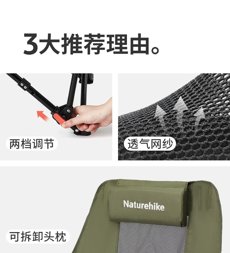 Naturehike挪客户外折叠躺椅露营椅子可坐可躺折叠午睡床便携沙滩椅子钓鱼椅 徒步绿【三挡可调/透气网纱】