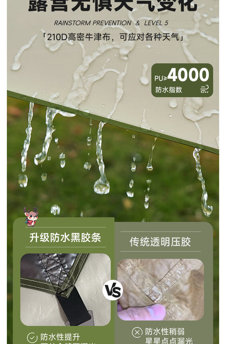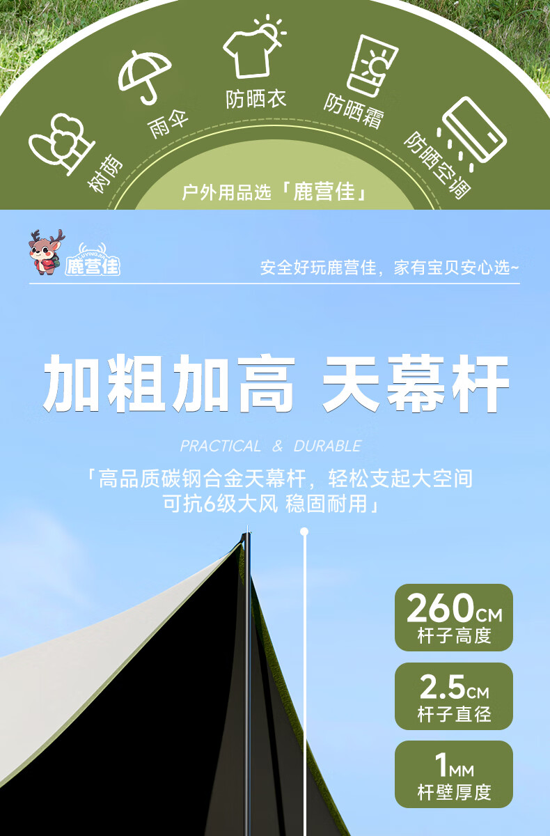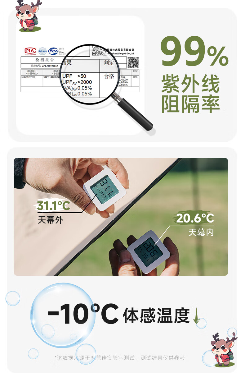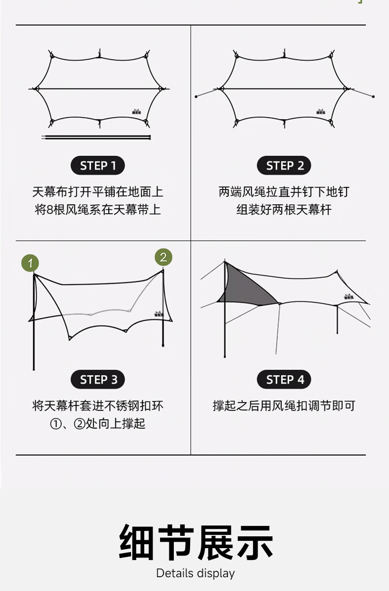 这款户外天幕非常出色,遮阳效果极佳,能有效阻挡紫外线,即使在炎热的夏天也能提供阴凉舒适的休息空间。防水性能优越,不惧风雨,材质坚固耐用,抗风能力强。搭建简便快捷,一个人也能轻松完成。无论是露营、野餐还是户外聚会,它都是不可或缺的好帮手。强烈推荐给喜欢户外活动的朋友们!