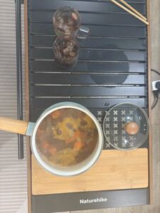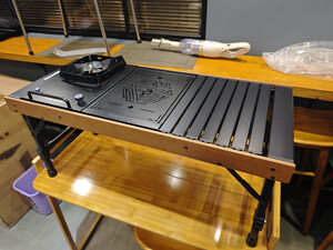 桌面是铝合金的一个蛋卷桌,可以直接放到洗碗机里去洗,非常的方便。然后我们也可以自己再定制一些不锈钢的i g t的面板,也方便扩展和打理,而且桌子拼装特别方便,非常的轻量化